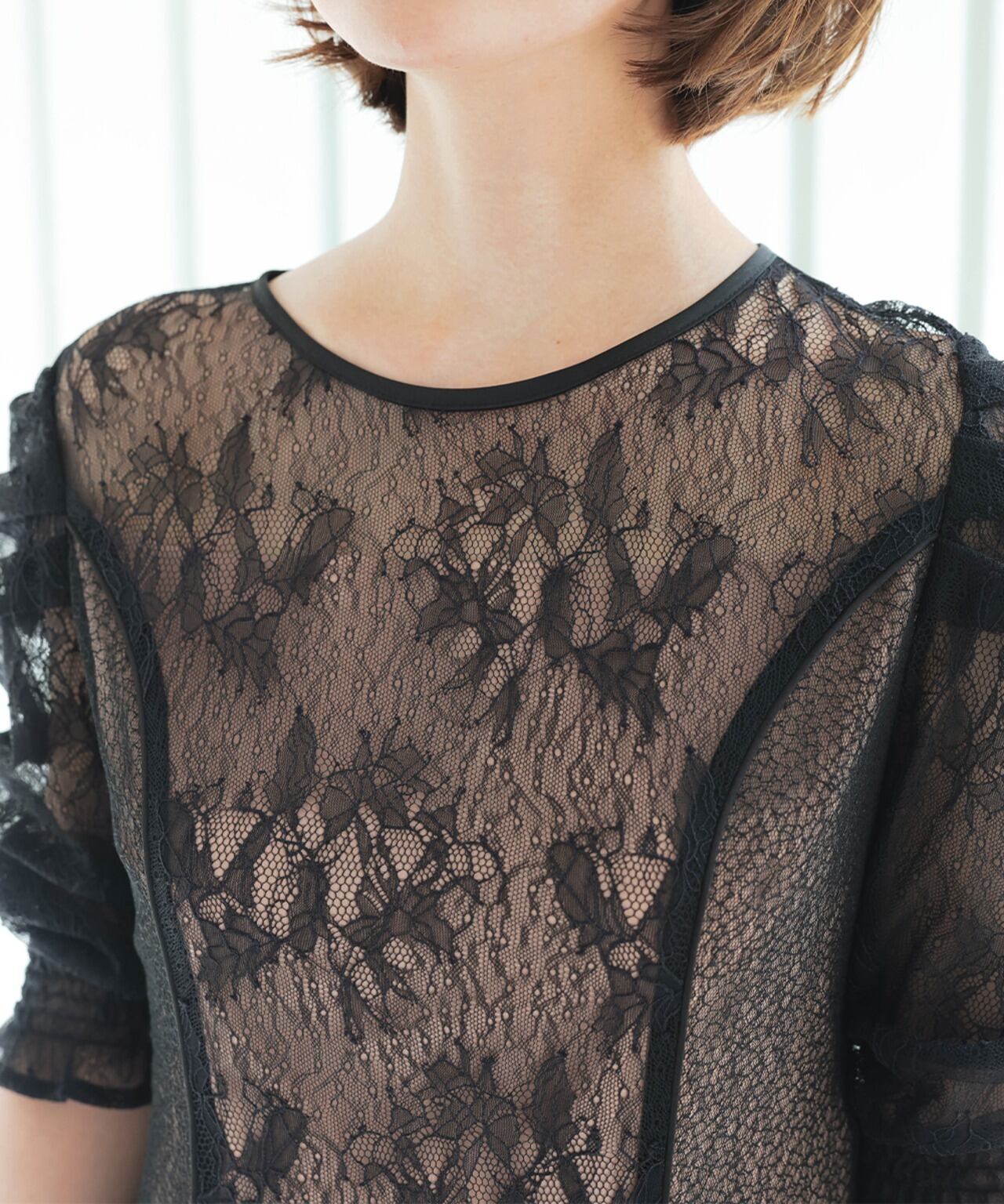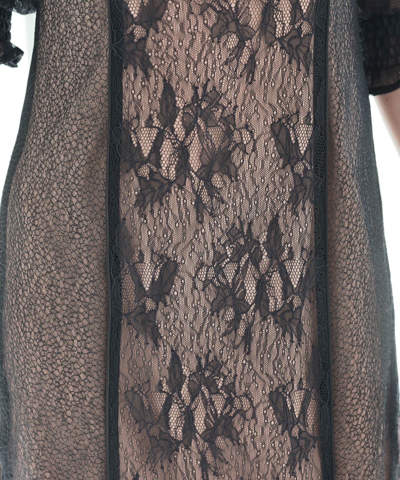 デコルテからセンターラインにかけて花柄レースが施されることで縦のラインを生み出しスタイルアップ効果◎