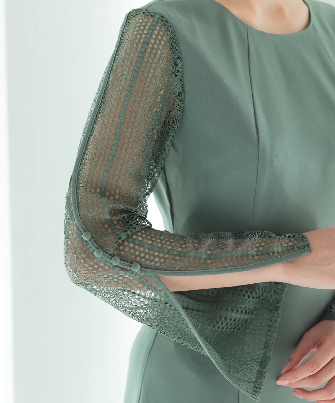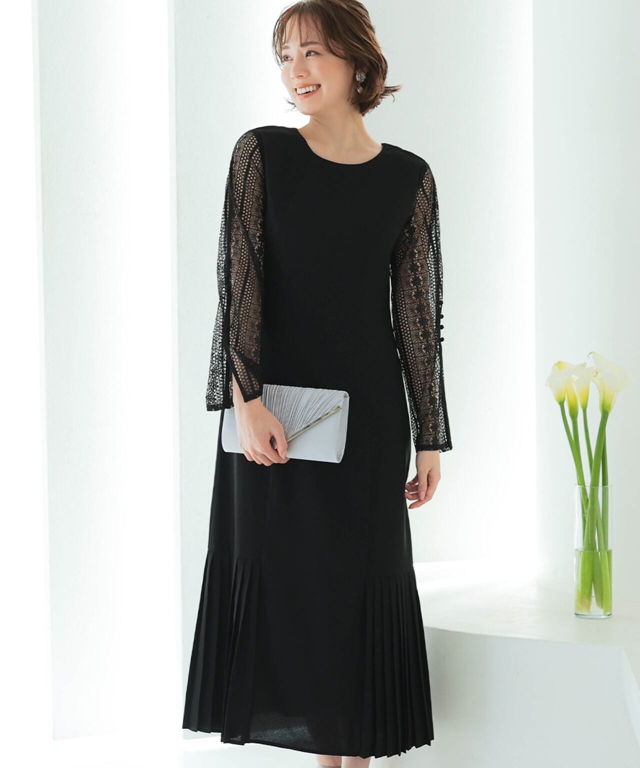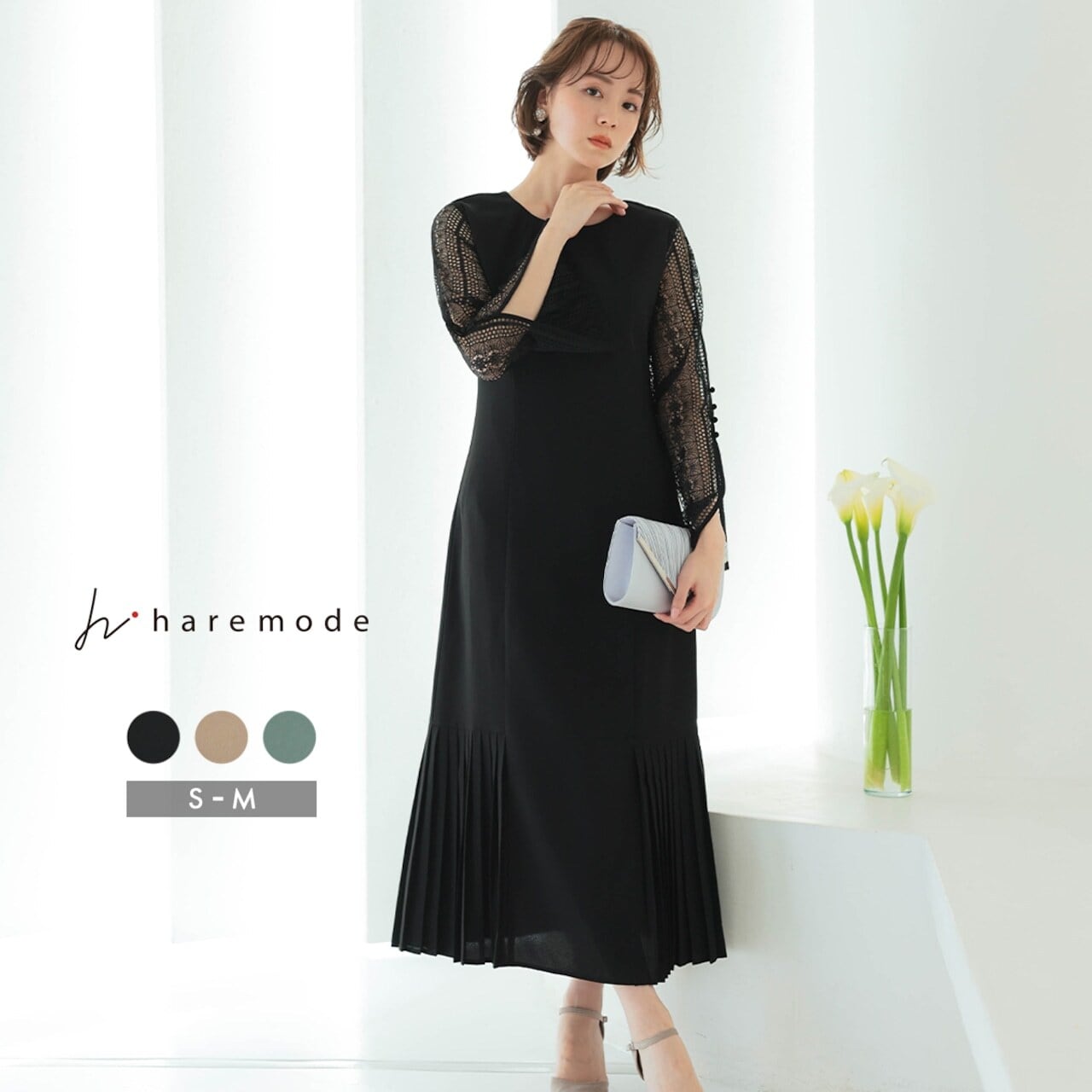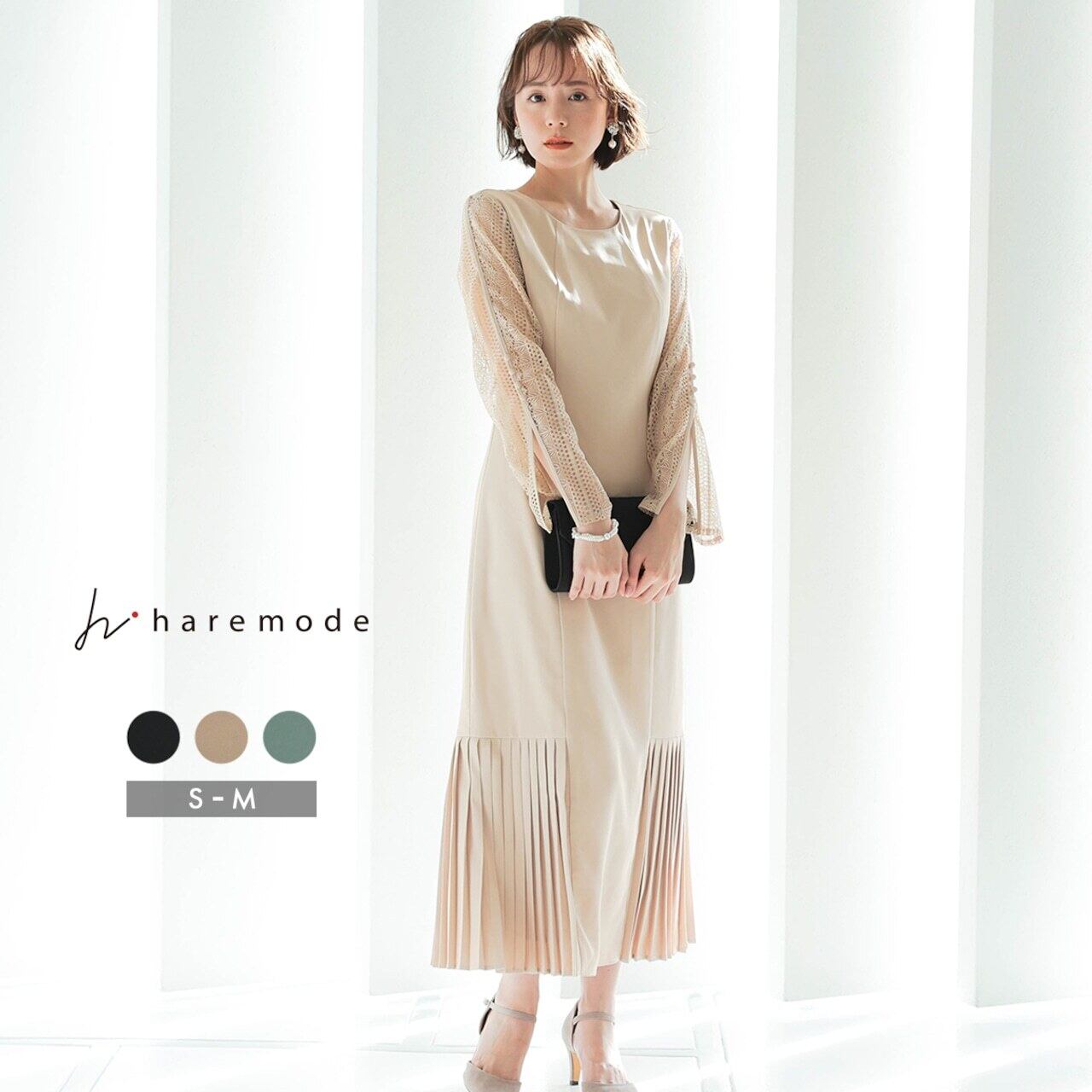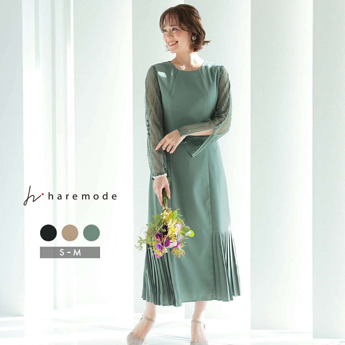 パーティードレス 結婚式 ワンピース ドレス オケージョンドレス 袖あり 長袖 スリット ミモレ丈 お呼ばれ 大人 フェミニン フレア スカート プリーツ S M おしゃれ シンプル グリーン ベージュ 黒 MORE AUNI 322196 OT8ドレス