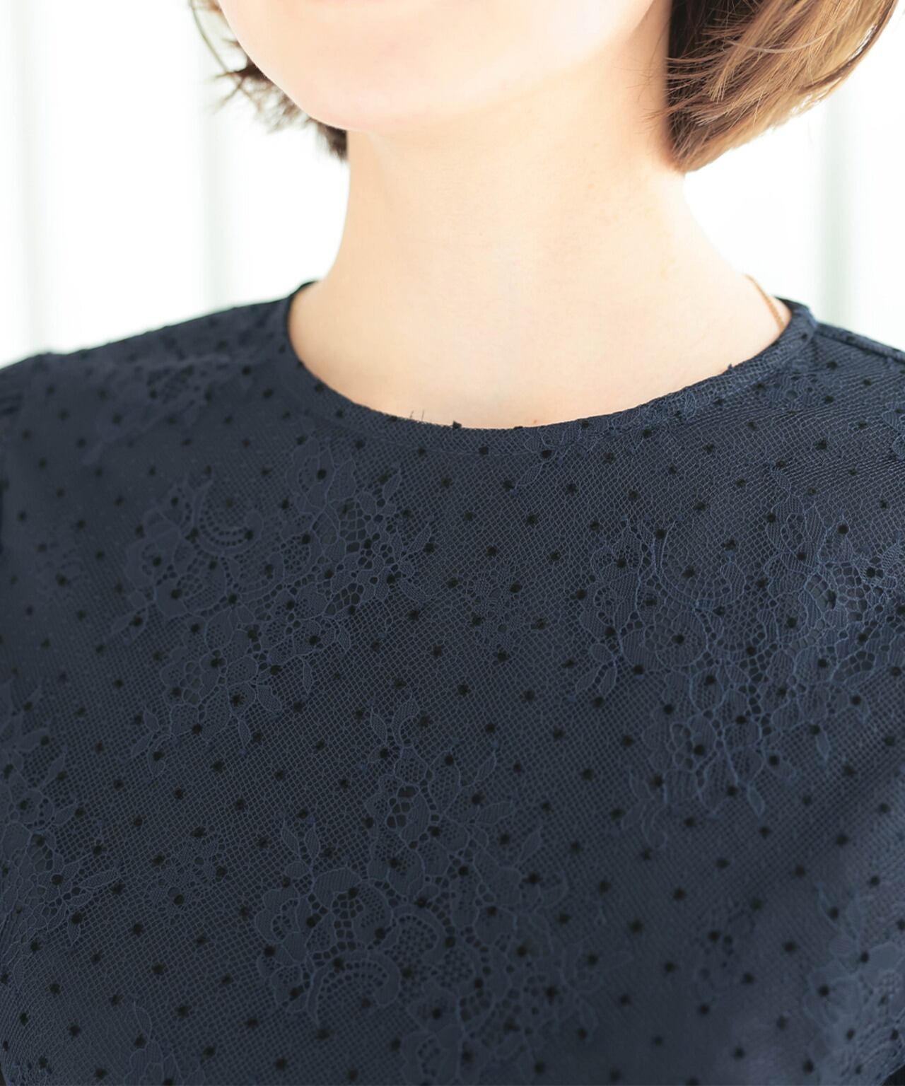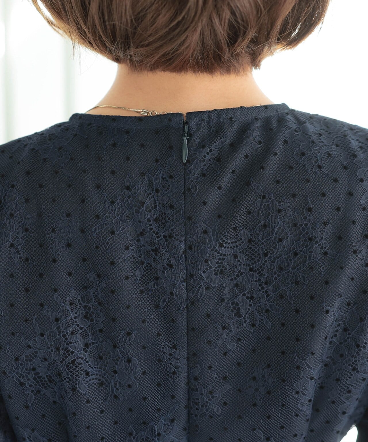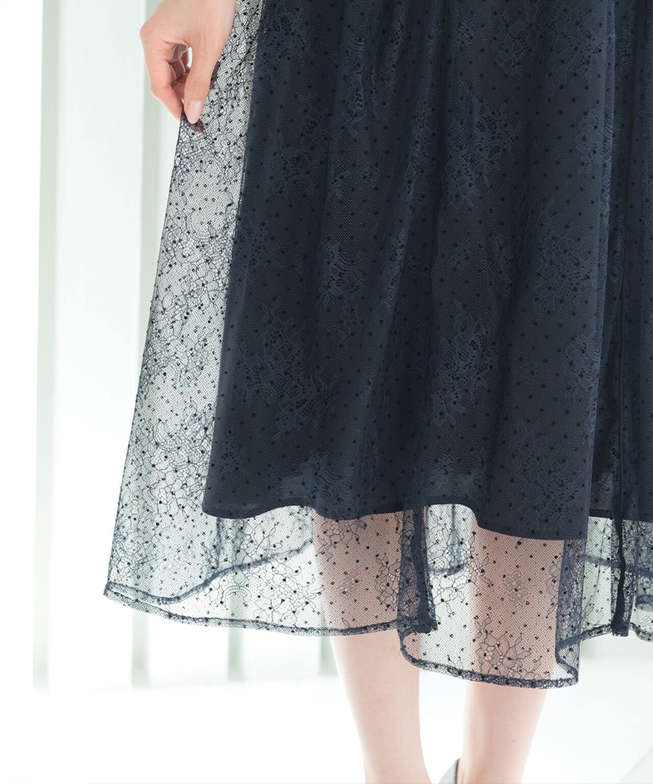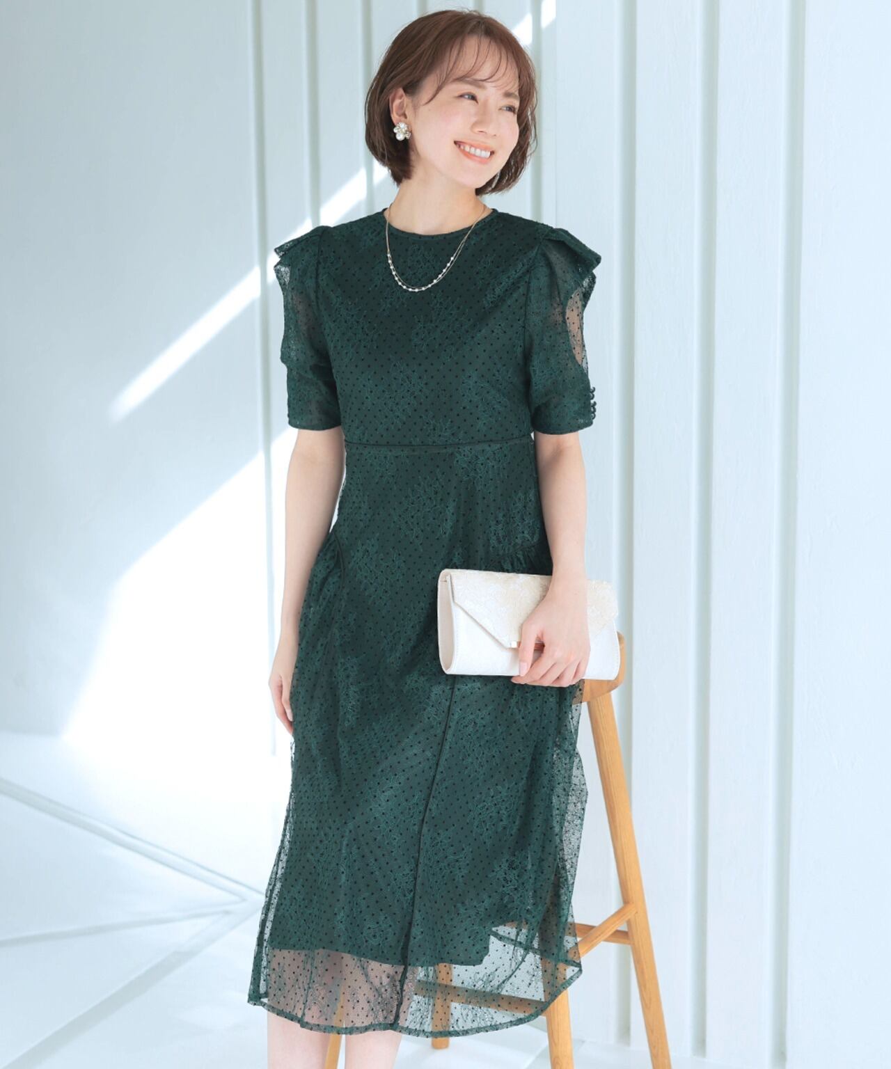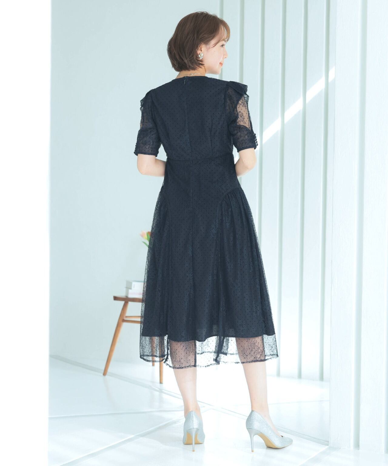 フロッキー加工のドット柄とAラインシルエットの組み合わせが可愛らしいドレス。