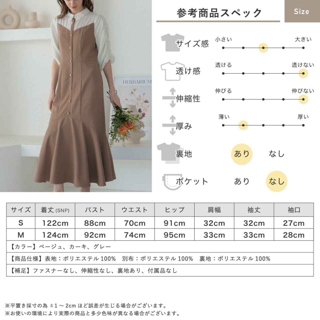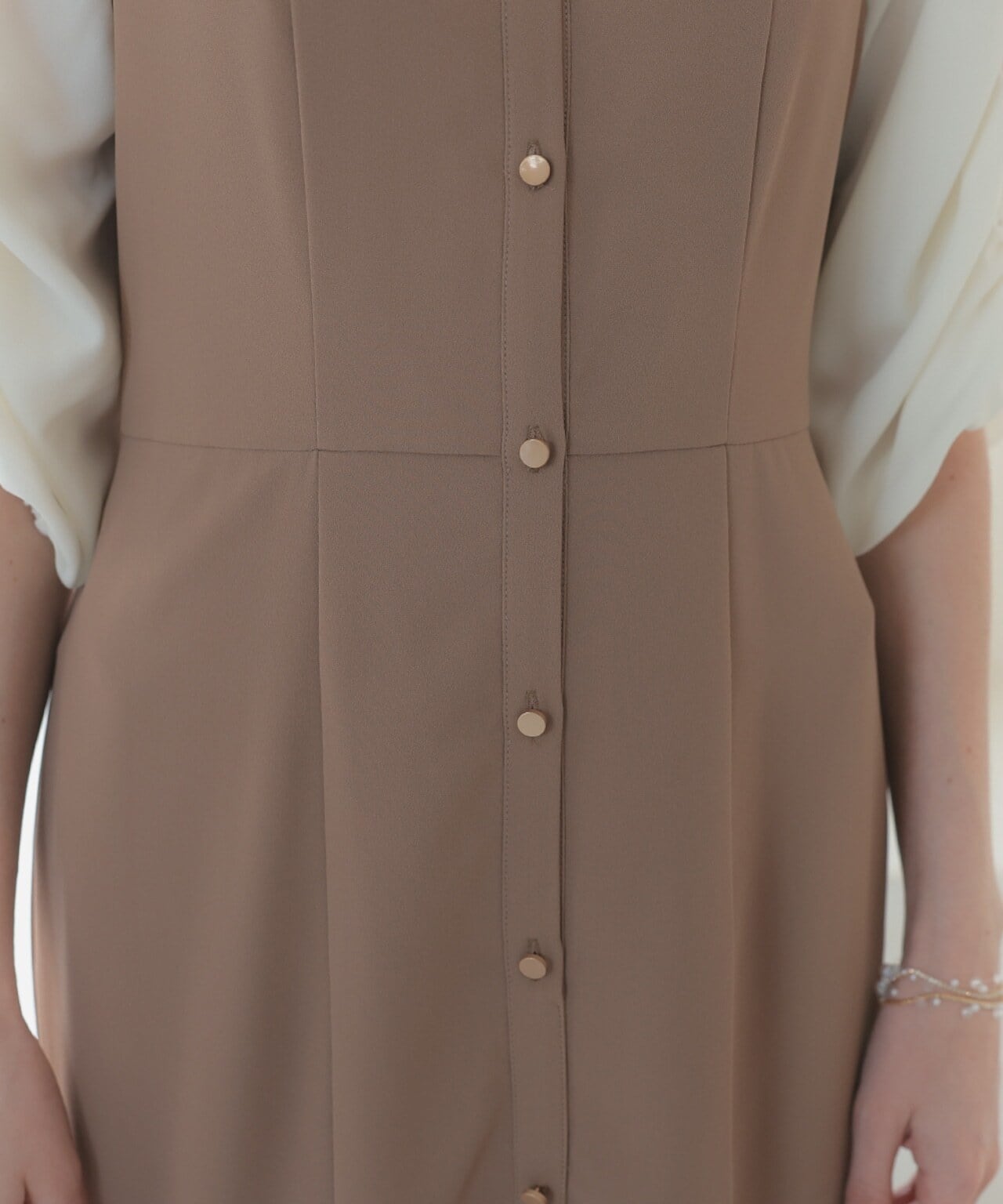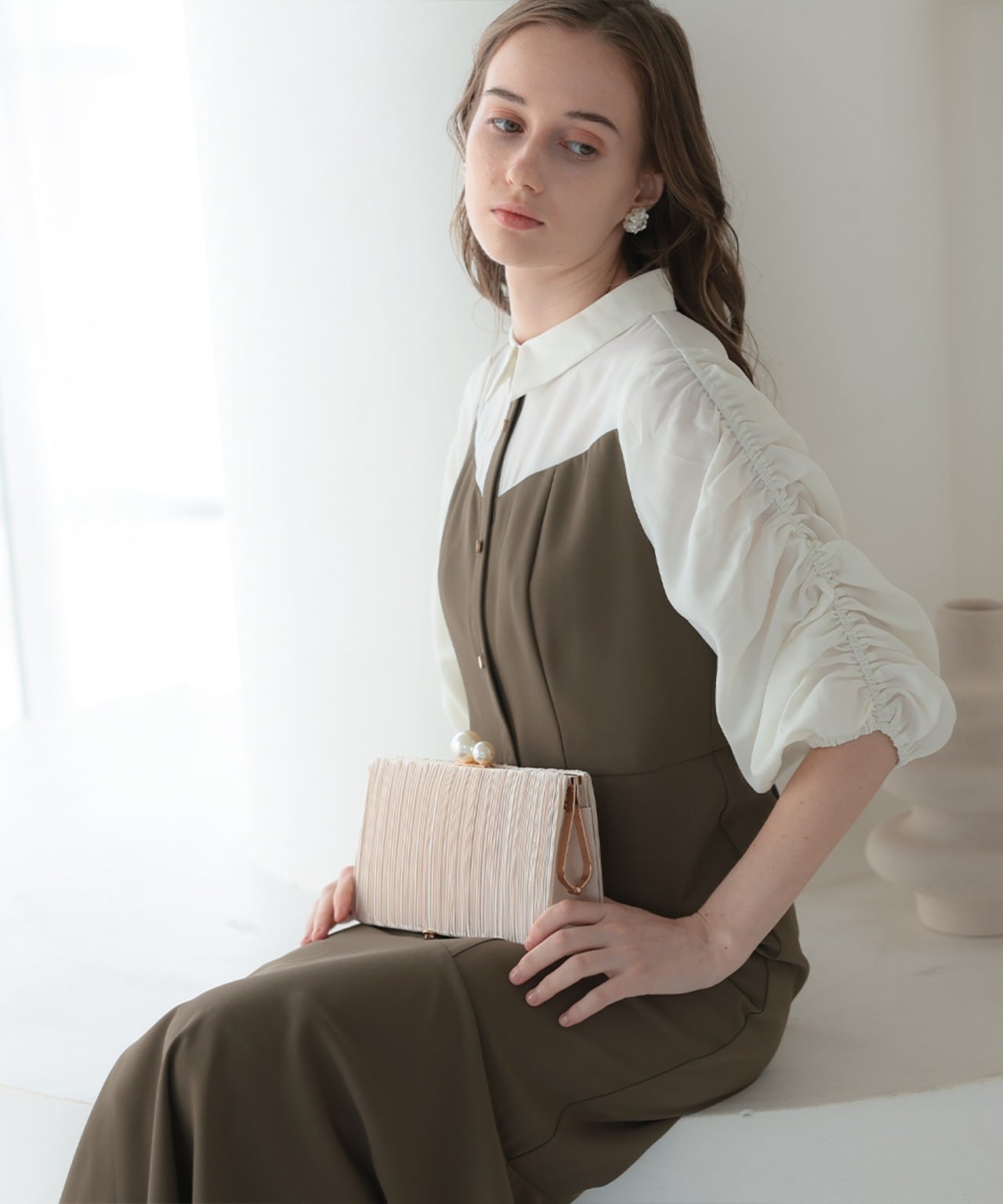 シャツ風な襟元と、胸元で切り替えられたデザインが特徴的。