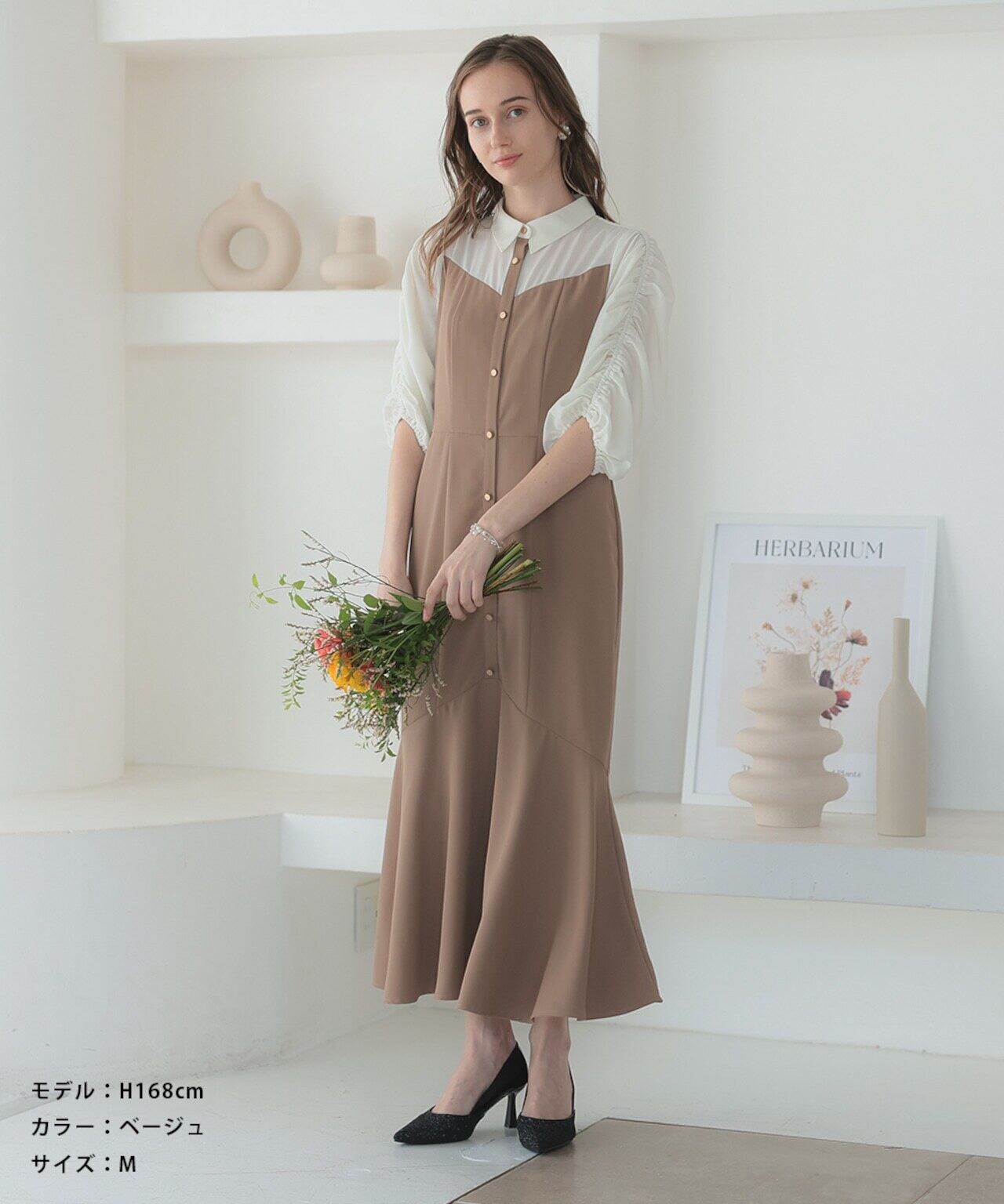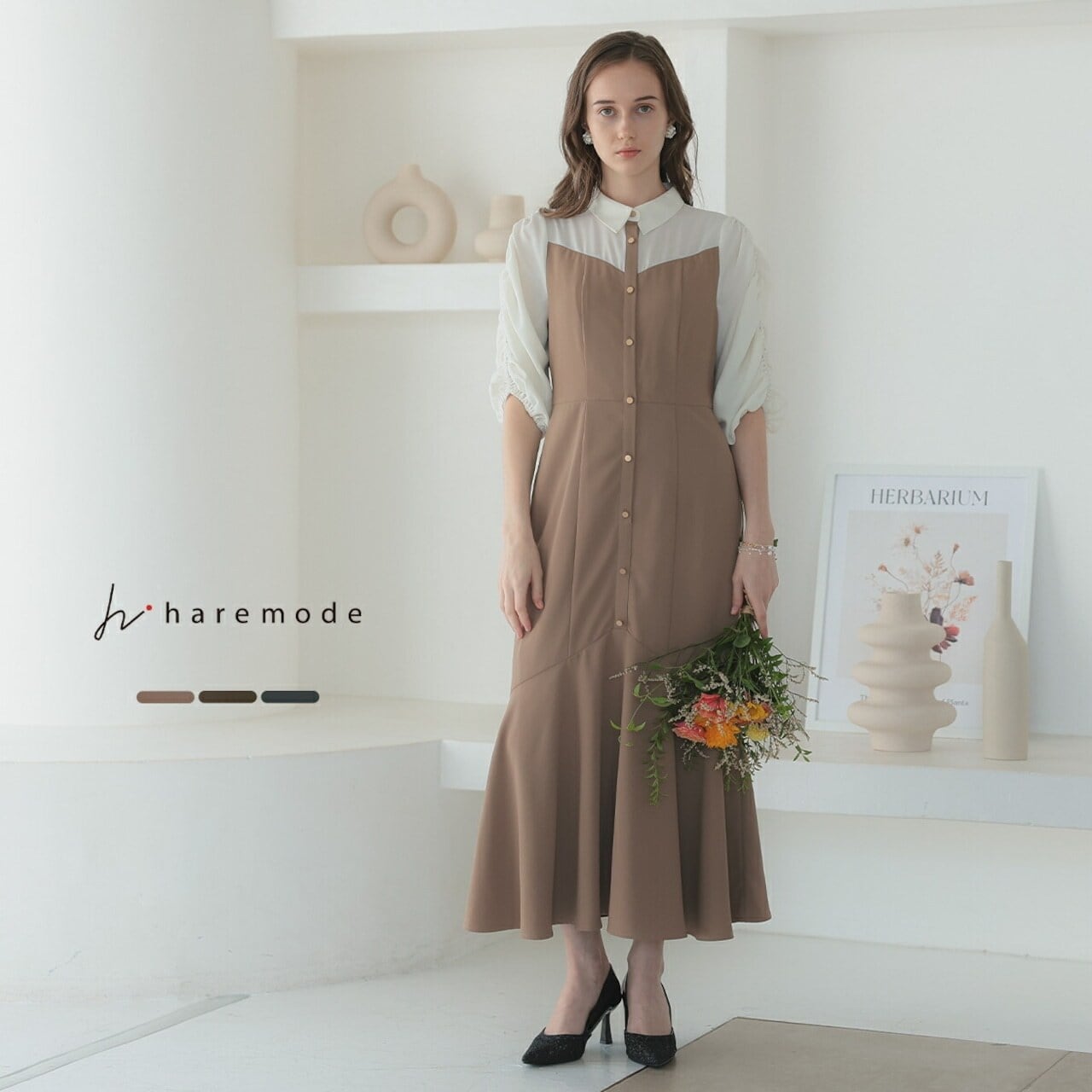 パーティードレス 結婚式 ワンピース ドレス 結婚式ドレス お呼ばれ 20代 30代 シャツ風 マーメイドスカート オケージョンドレス 袖あり 半袖 五分袖 カジュアル ロング バックリボン ロング丈 オケージョン haremode 323214