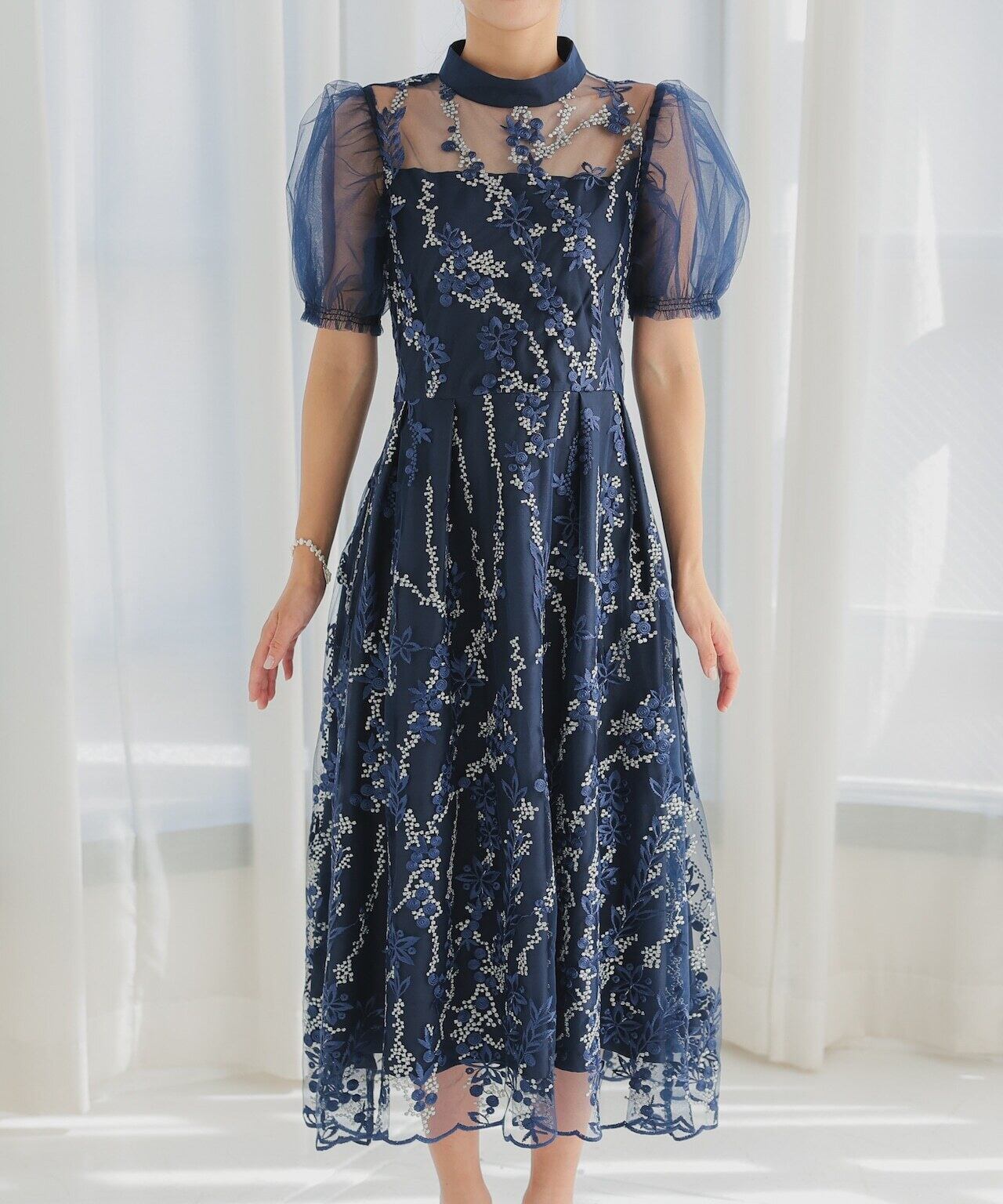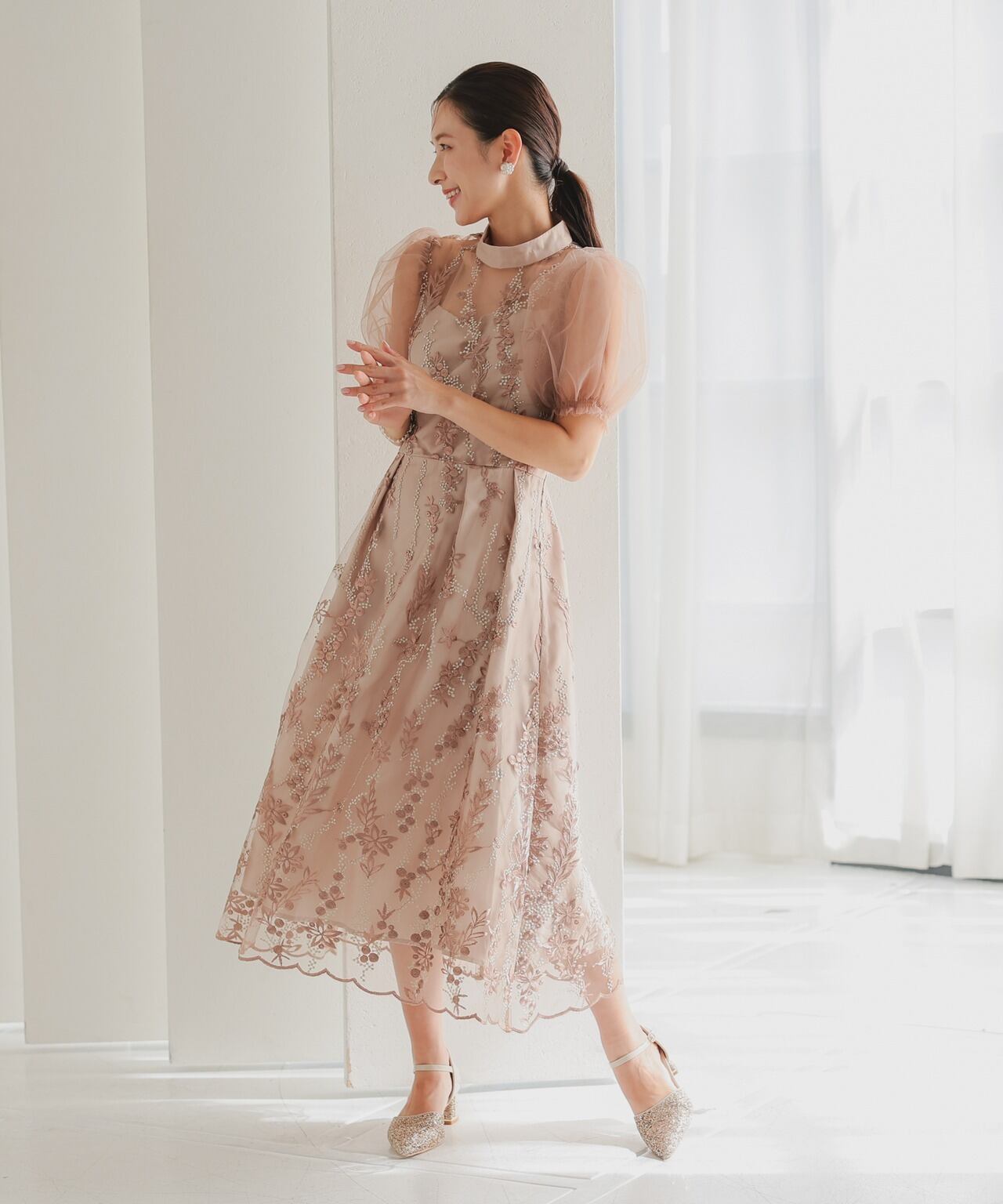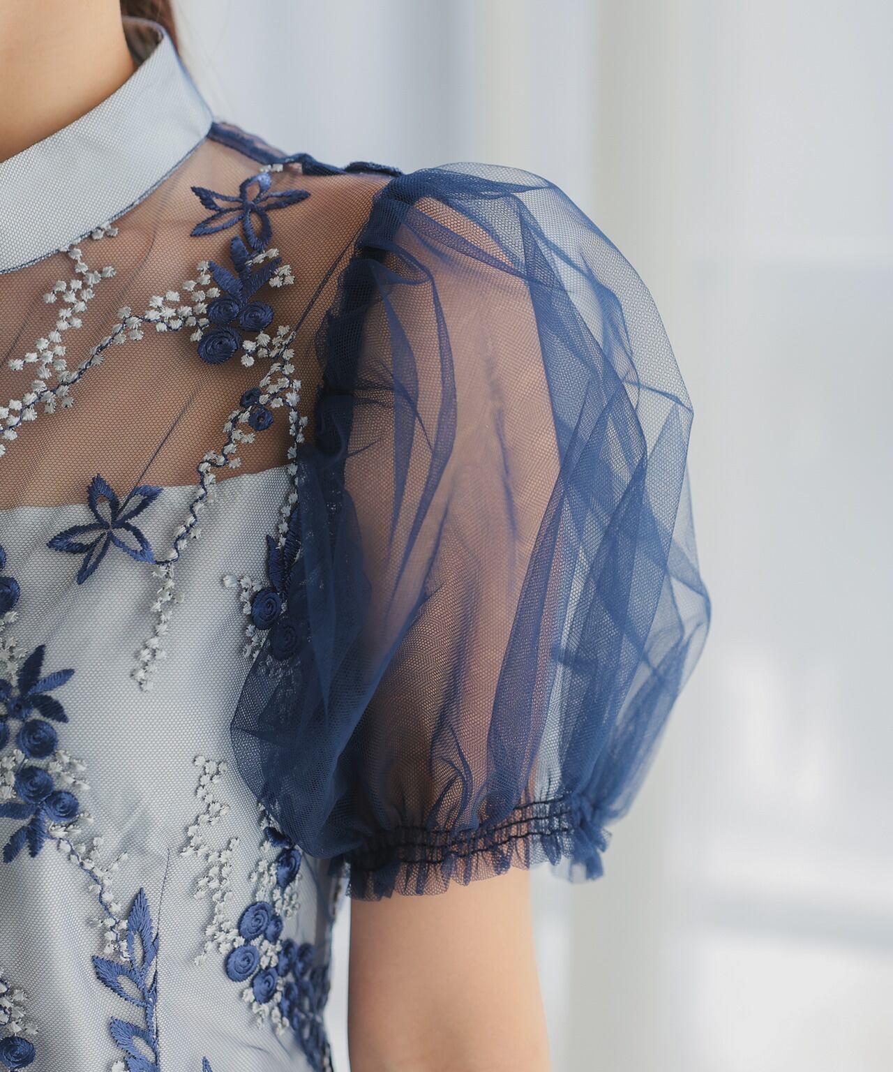 プリンセスのような華やかさがあるドレス。生地に使用している刺繍も華やかさを引き立たせてくれます。さらに袖部分は丸みを出したデザインで可愛らしく、気になる二の腕をさりげなくカバー。