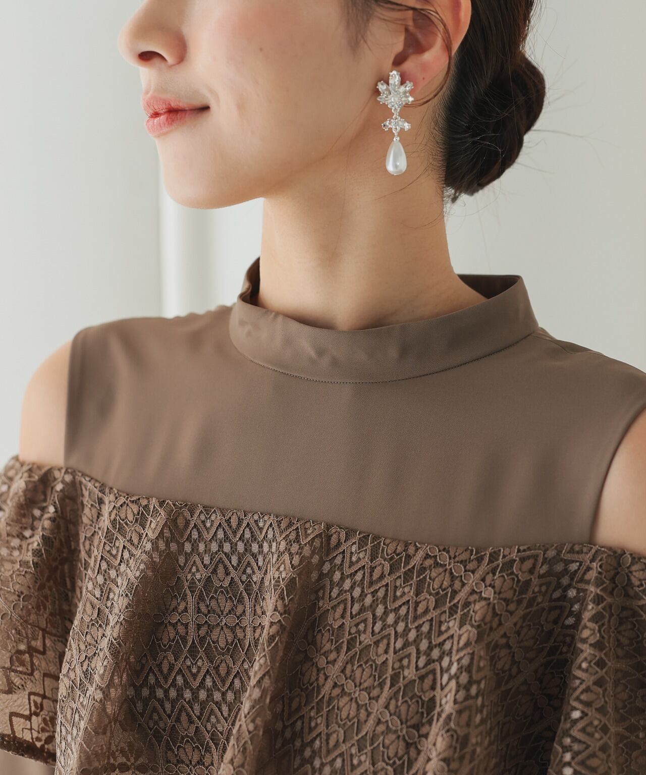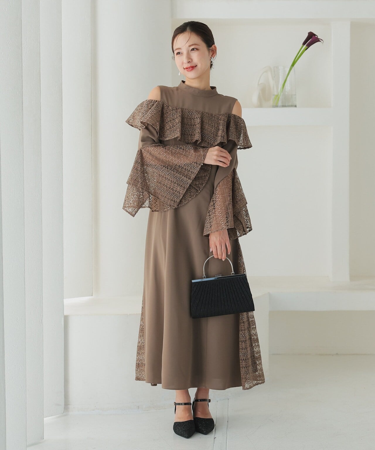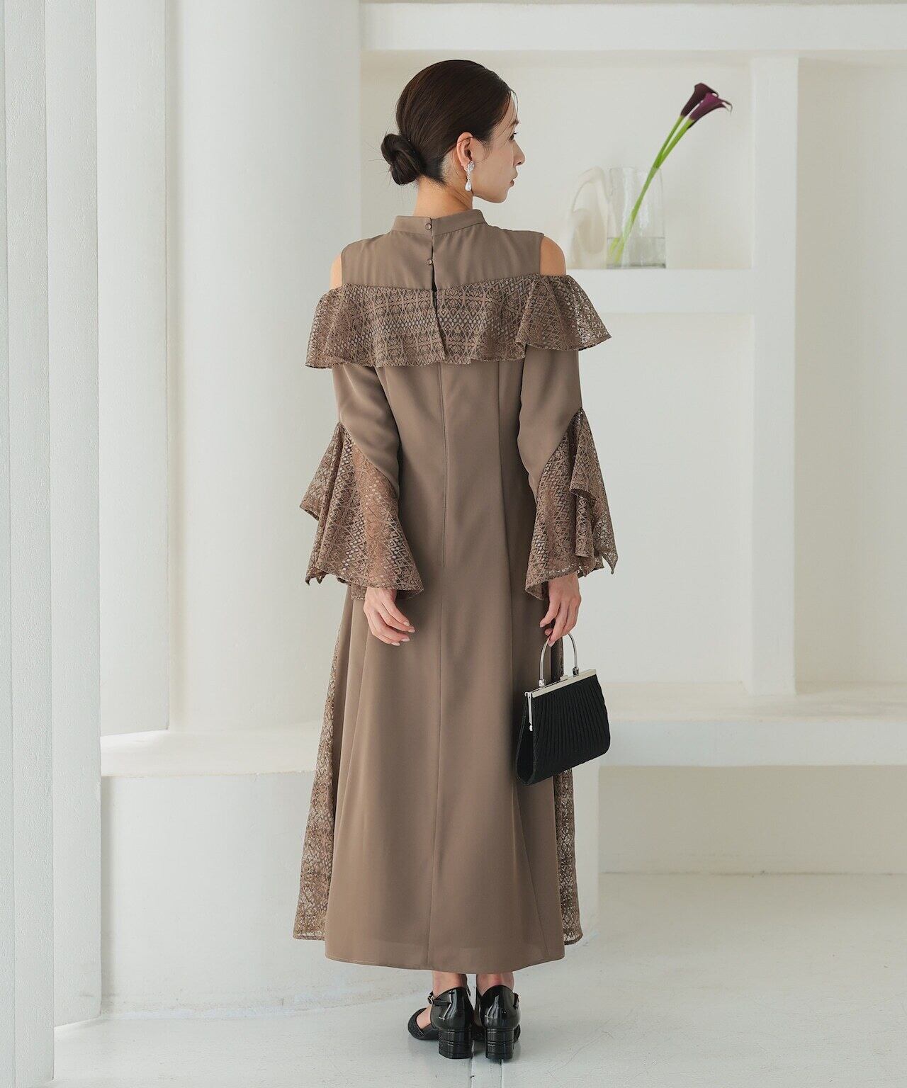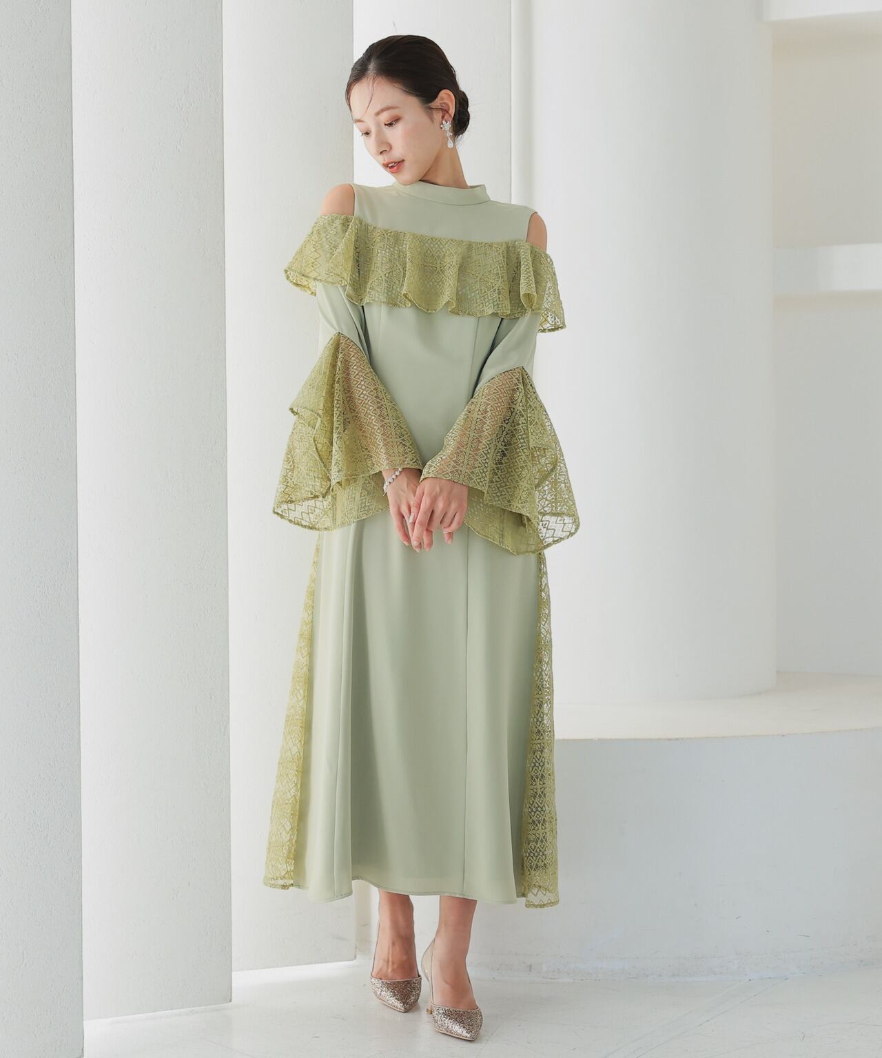 王道のお呼ばれドレスのデザインとは少し離れたデザインで、自分の個性が存分に発揮できます。袖部分のレースには大きくスリットが入っているのでお気に入りのアクセサリーが映えやすくなります。1枚でも十分華やかになるドレスですが、お好きなアクセサリーやバッグをつけて差し色にしても◎