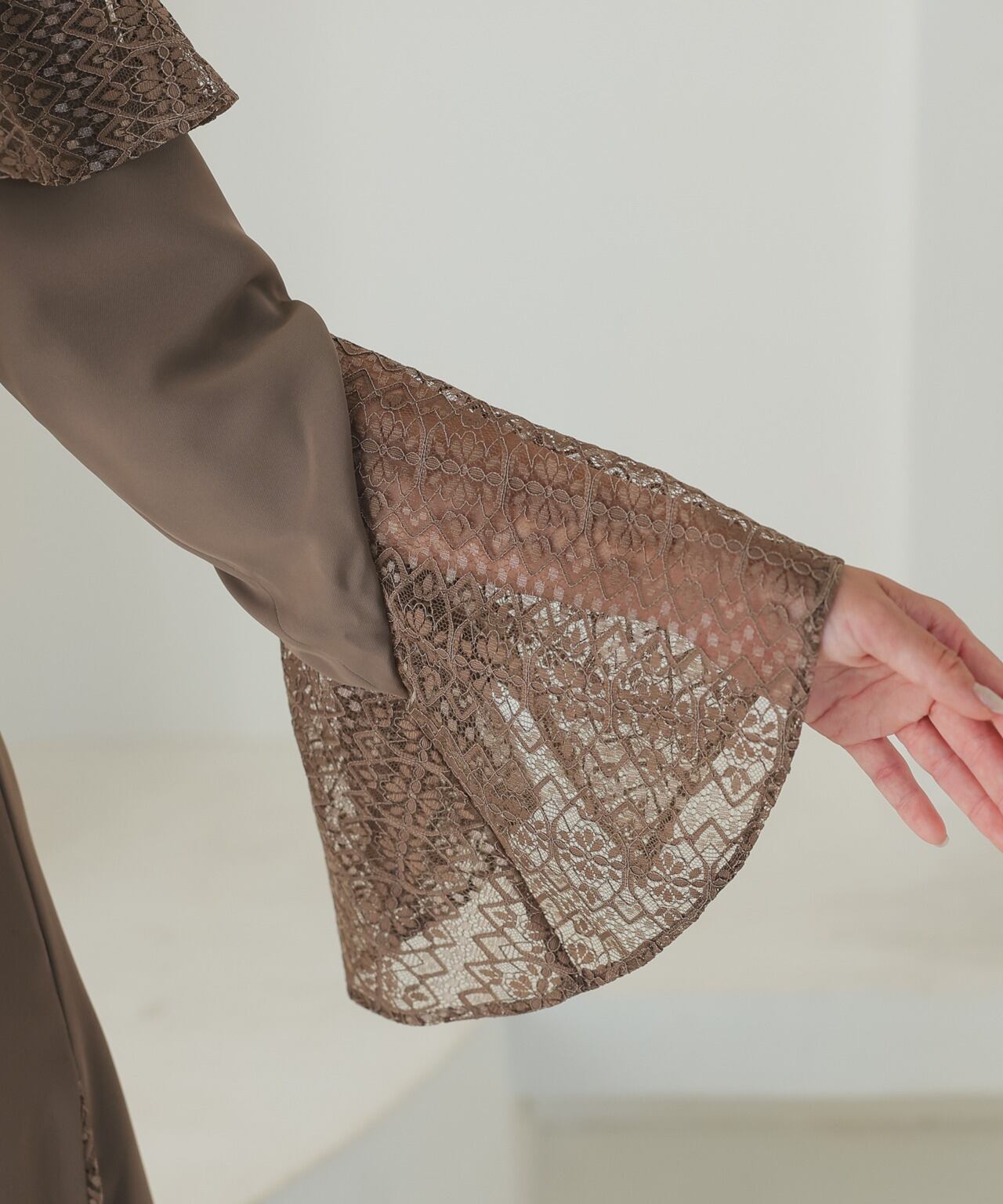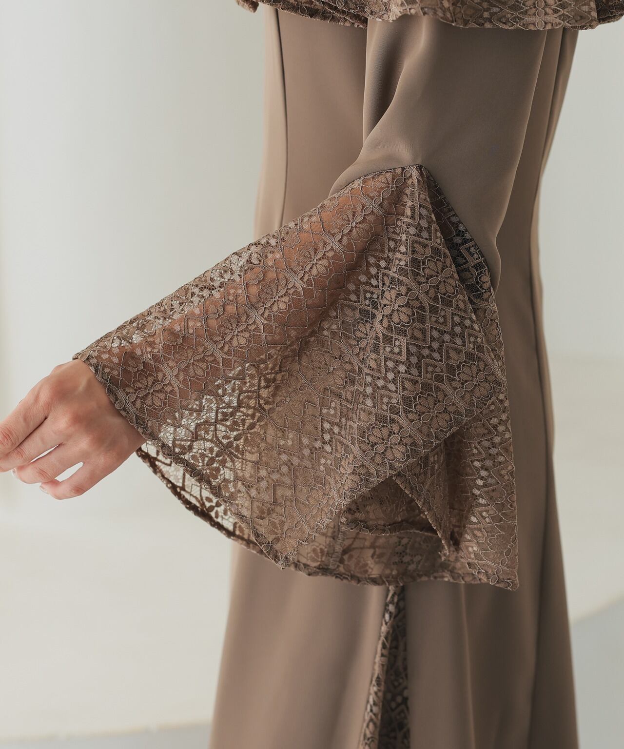 生地をたっぷり使用した贅沢なドレス。胸元、袖、スカートのサイドに透け感のあるレースを採用しているので生地をたっぷり使用していても重たくなりすぎることはありません。ワンピース自体も身体をきれいに見えるデザインなのでどんな方でも着やすいドレスです。