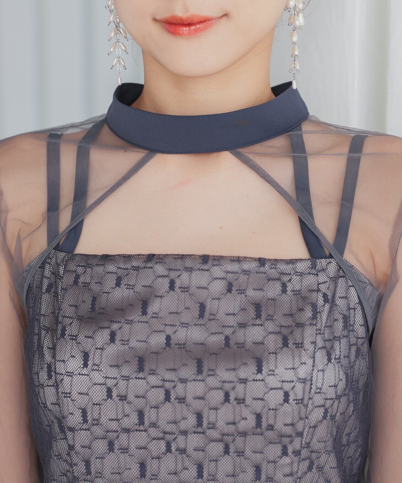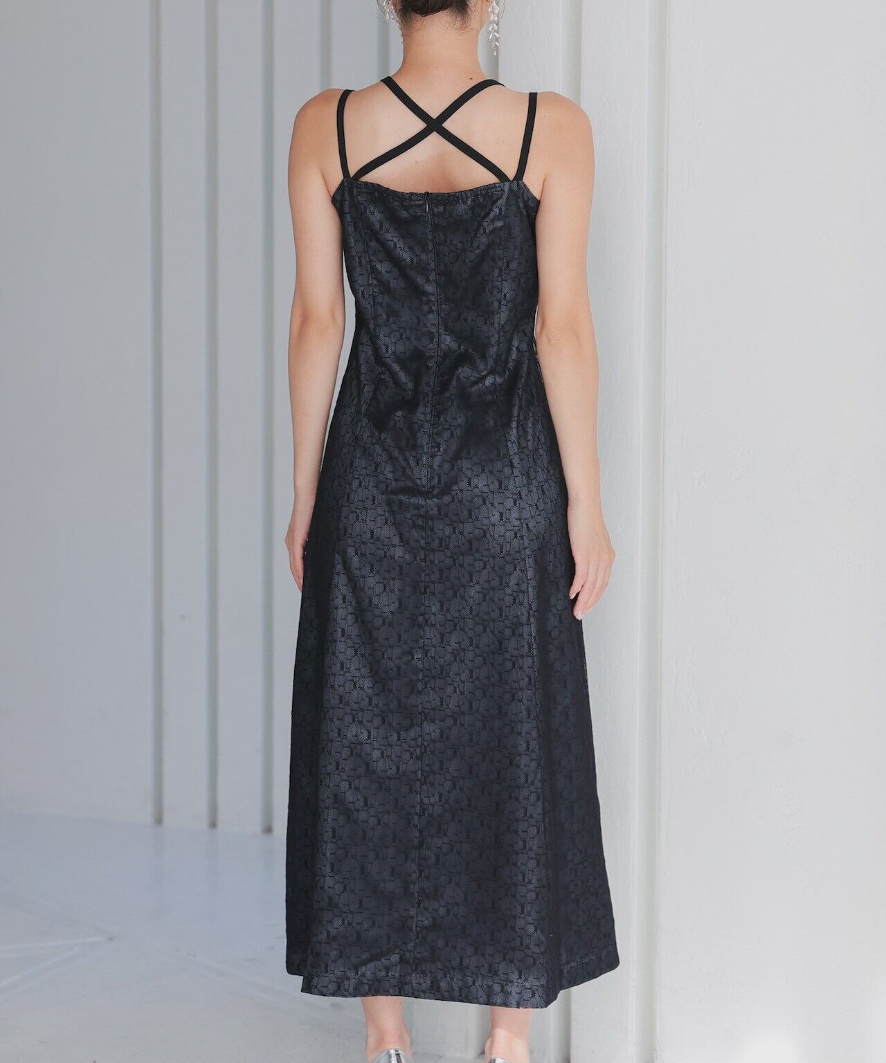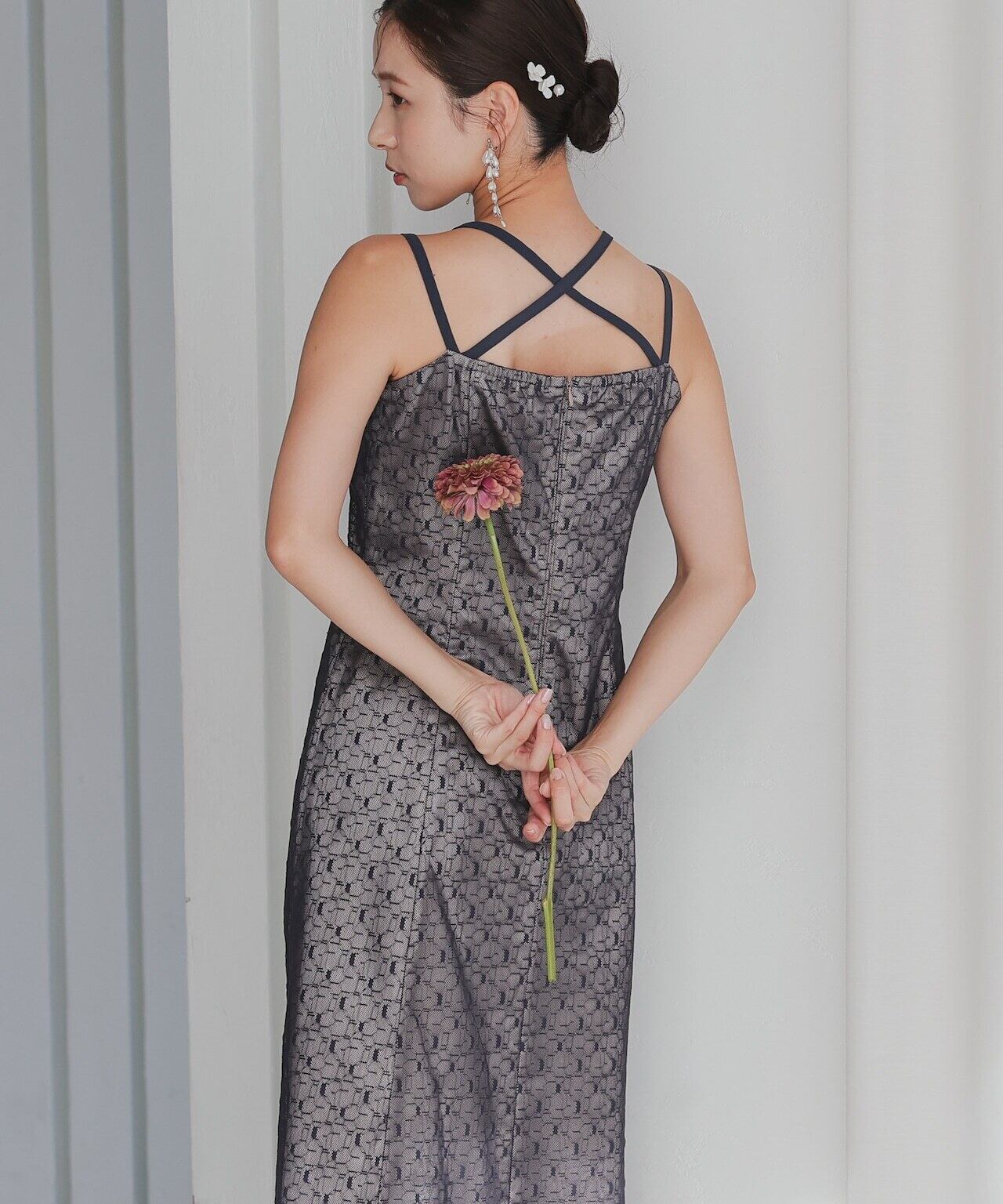 ワンピースとショート丈のチュールボレロがセットになったドレス。トップスチュールは袖にギャザーを寄せて華やかに。ワンピースのレースは幾何学模様で派手過ぎず、今っぽさを演出してくれます。ワンピースの肩紐は前後どちらでもクロス可能。ワンピースの肩紐はクロスさせることで体のラインを美しく見せてくれます。前でクロスしても後ろでクロスしてもOKなデザインなので、その日の気分次第です。