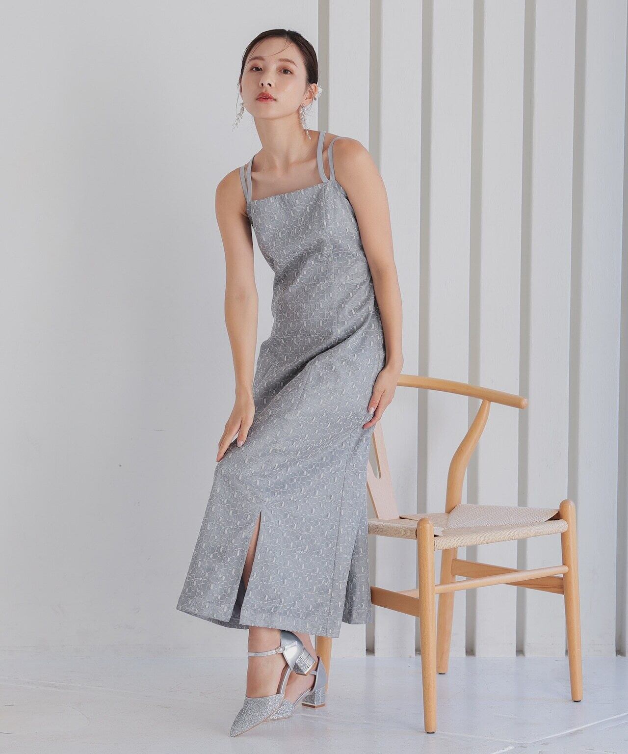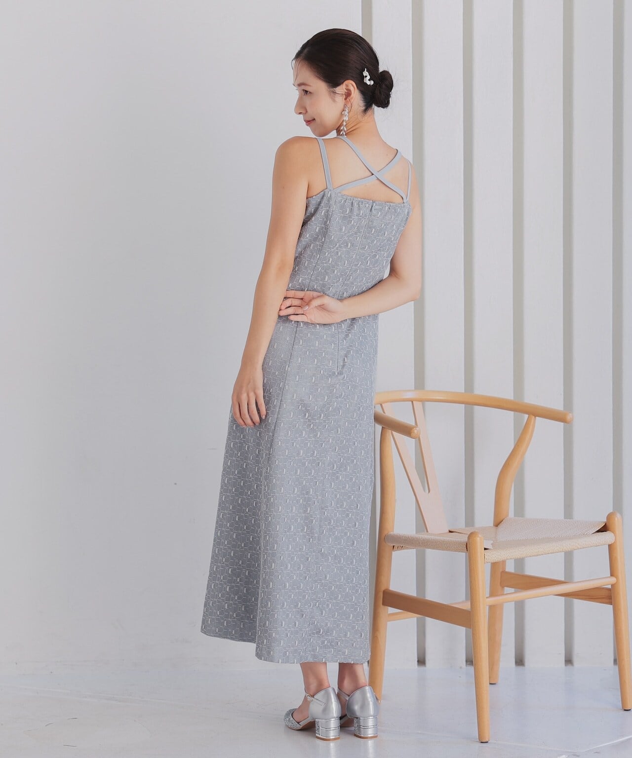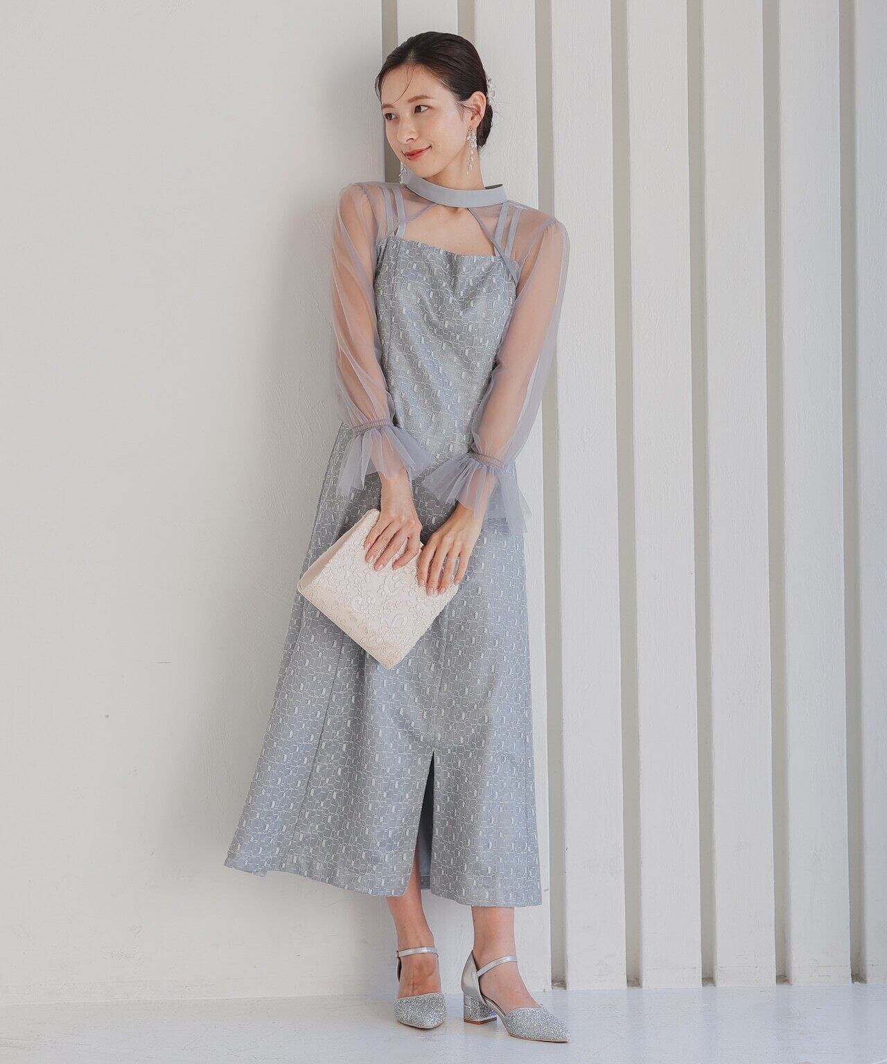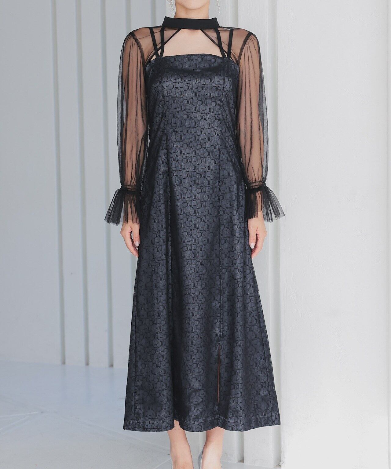 ワンピースとショート丈のチュールボレロがセットになったドレス。トップスチュールは袖にギャザーを寄せて華やかに。ワンピースのレースは幾何学模様で派手過ぎず、今っぽさを演出してくれます。ワンピースの肩紐は前後どちらでもクロス可能。ワンピースの肩紐はクロスさせることで体のラインを美しく見せてくれます。前でクロスしても後ろでクロスしてもOKなデザインなので、その日の気分次第です。