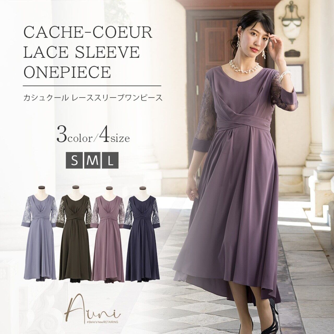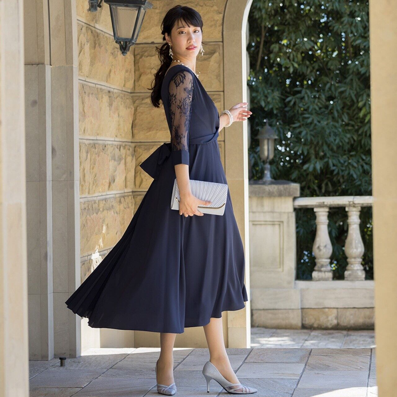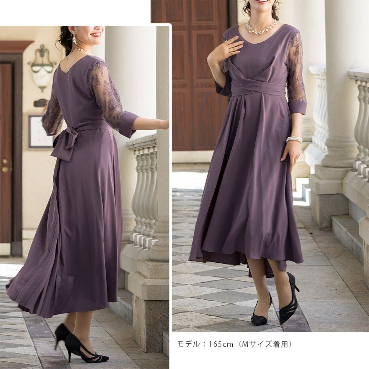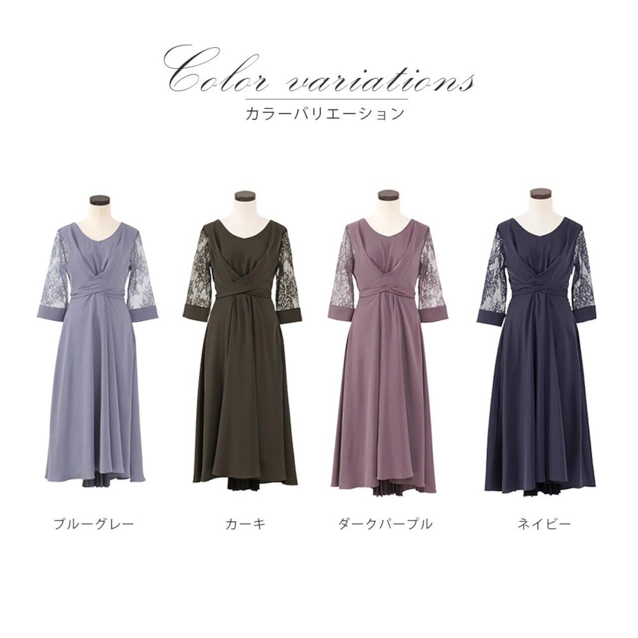パーティードレス 結婚式 ワンピース ドレス ロング丈 袖あり お呼ばれ レースワンピース レース フォーマル 7分袖 エレガント プリーツ フレア ロング フィッシュテール 2次会 披露宴 S M L auni 77000020