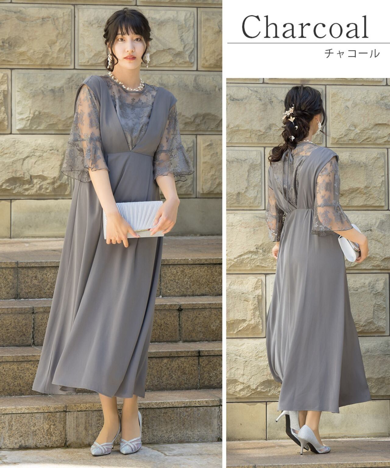 顔周りをすっきりと見せてくれる深めVネックのジャンパードレスと、ベルスリーブのレーストップスのセット。
