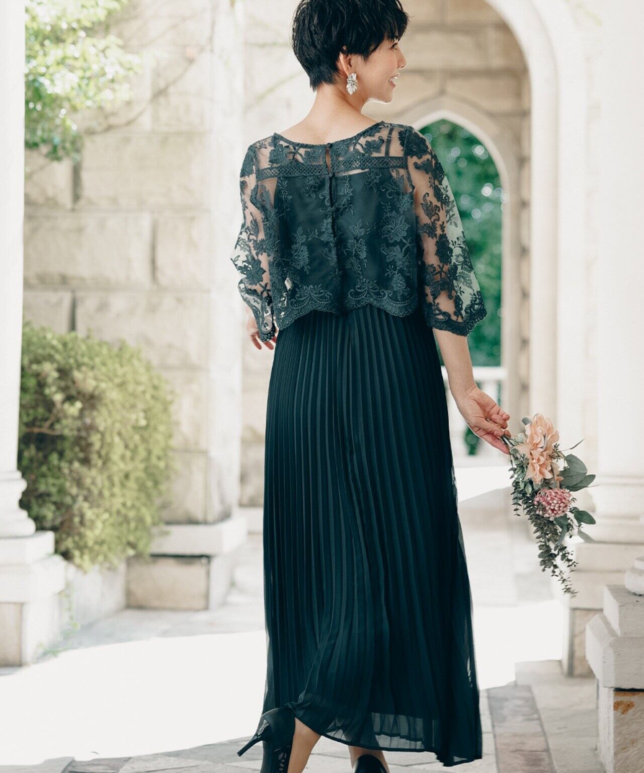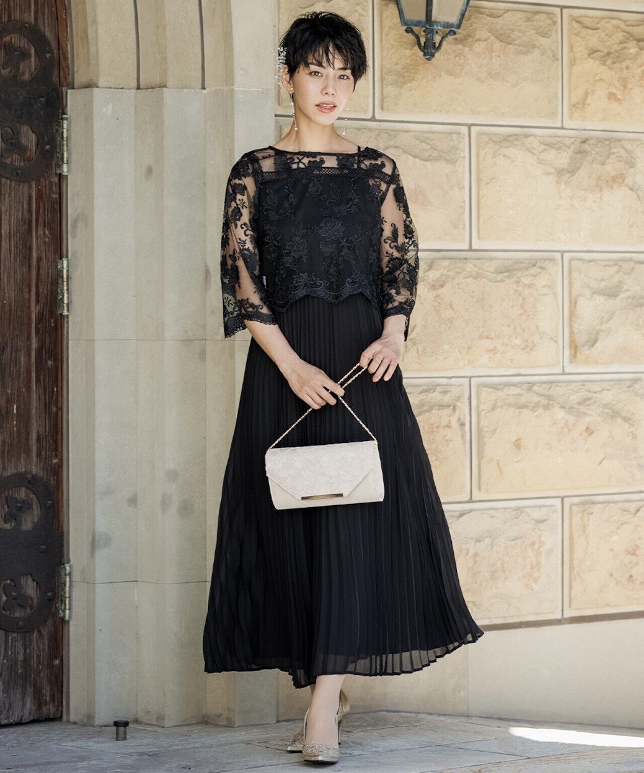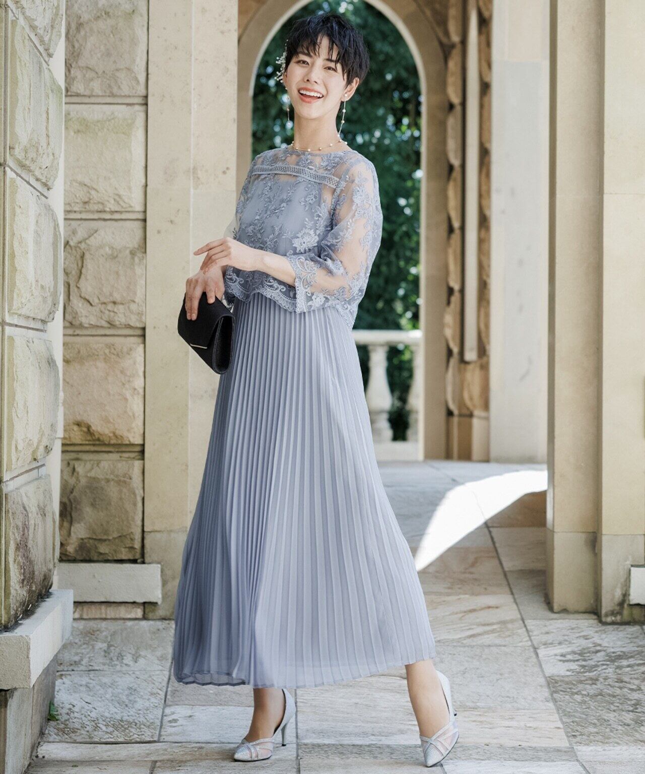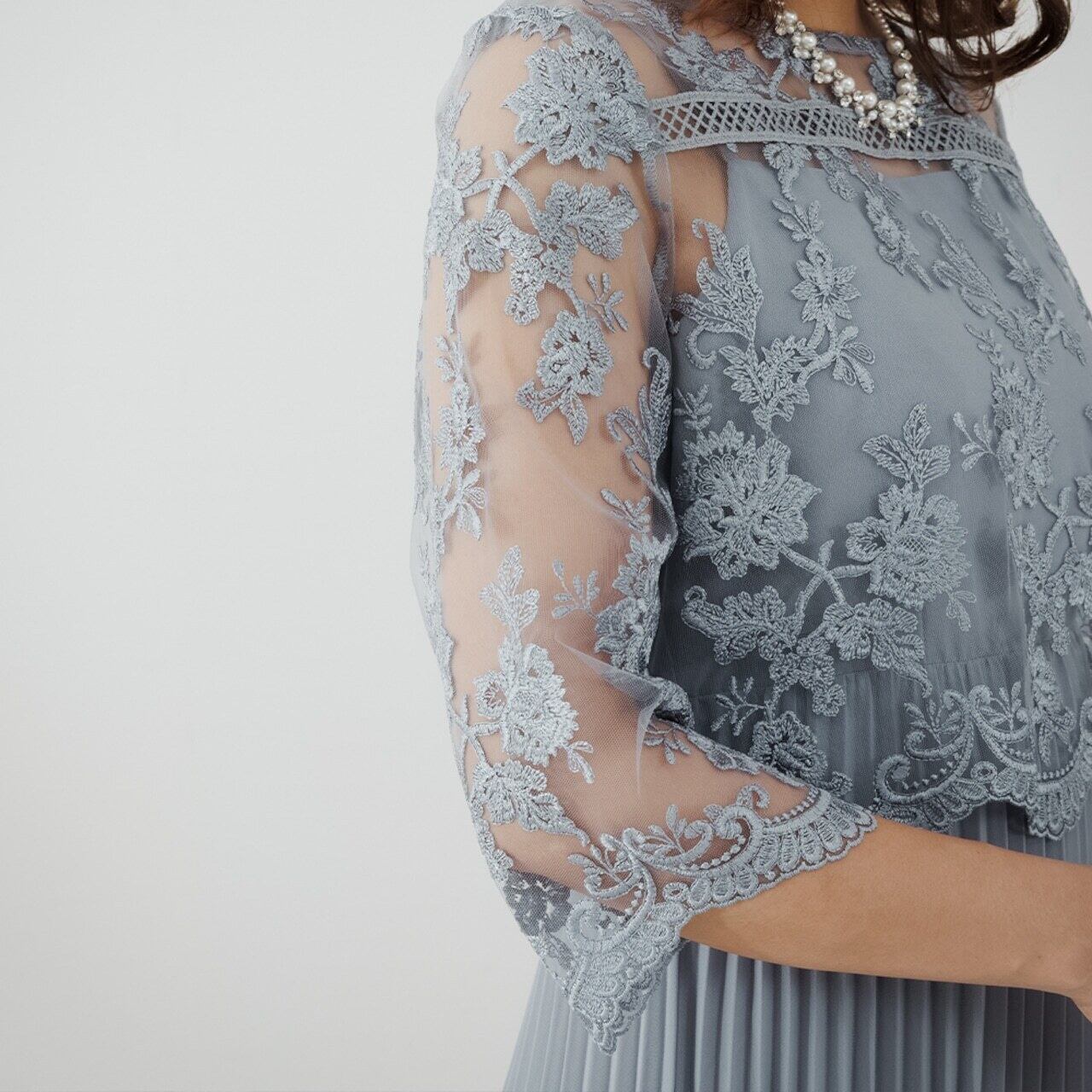 刺繍の花柄ショートボレロは、上品で繊細なレースを使用し、袖はやや広がりのあるベルスリーブ。透け感のあるプリーツスカートは、動くたびに揺れるシルエットが美しく印象的。