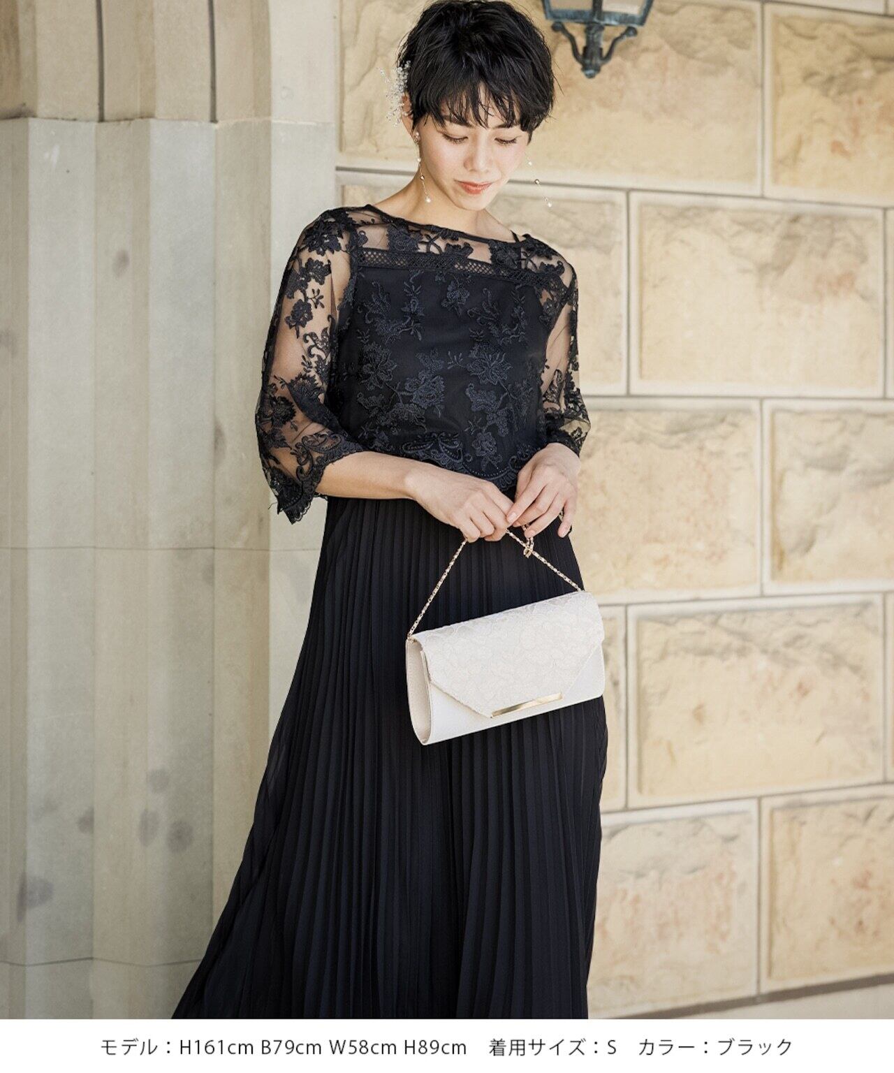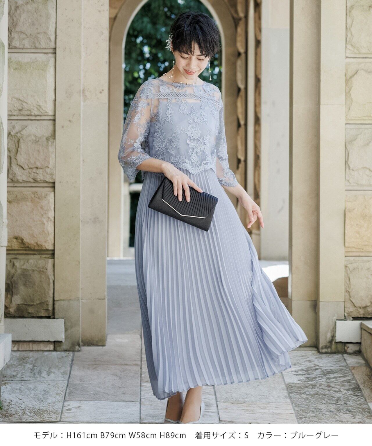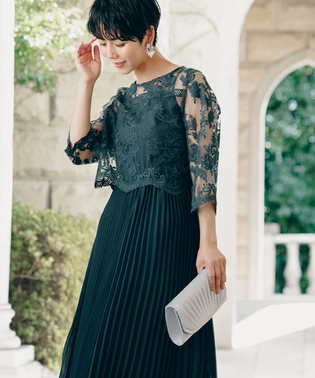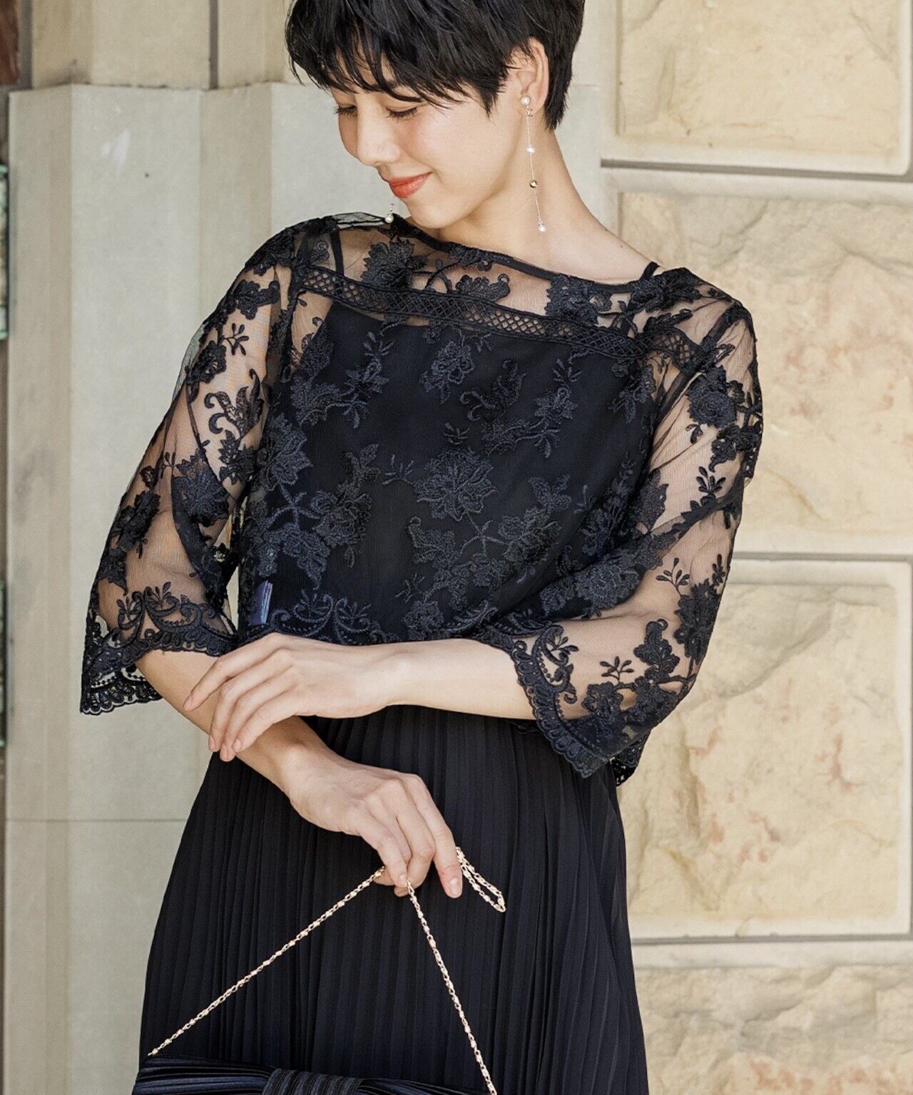 刺繍の花柄ショートボレロは、上品で繊細なレースを使用し、袖はやや広がりのあるベルスリーブ。透け感のあるプリーツスカートは、動くたびに揺れるシルエットが美しく印象的。