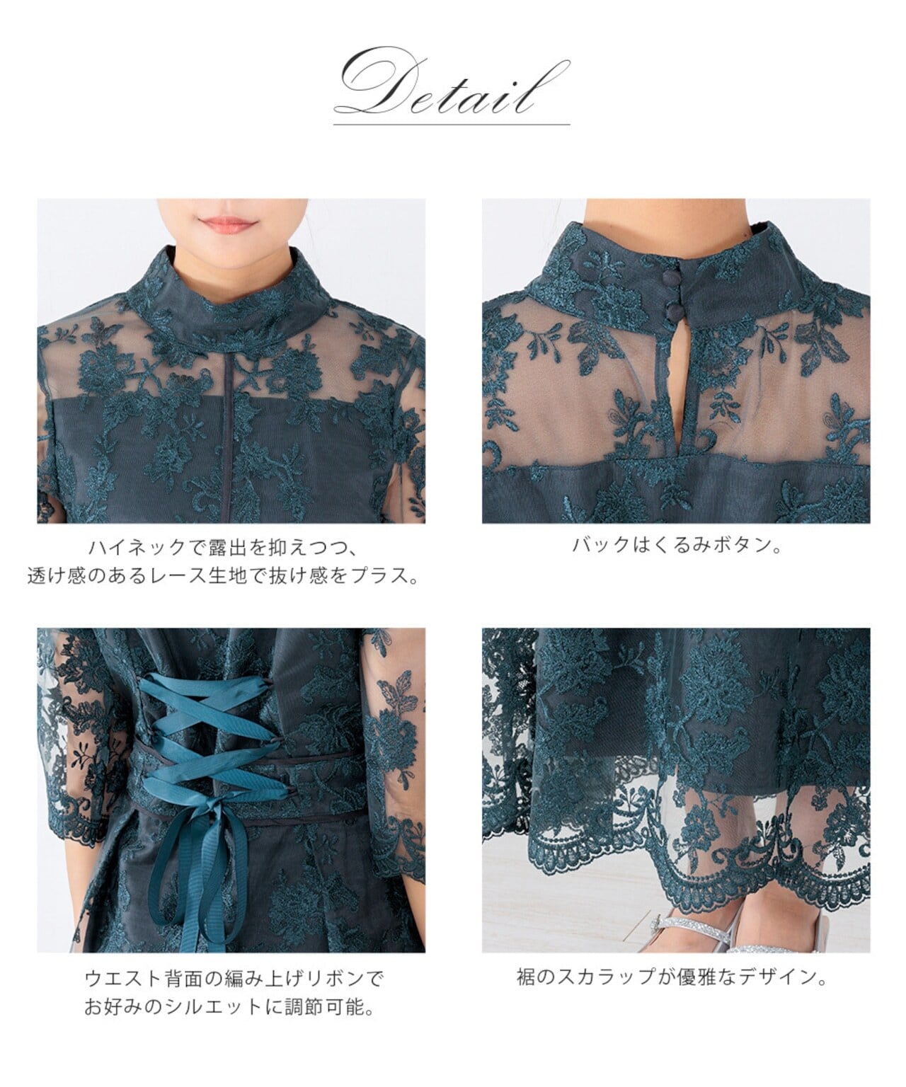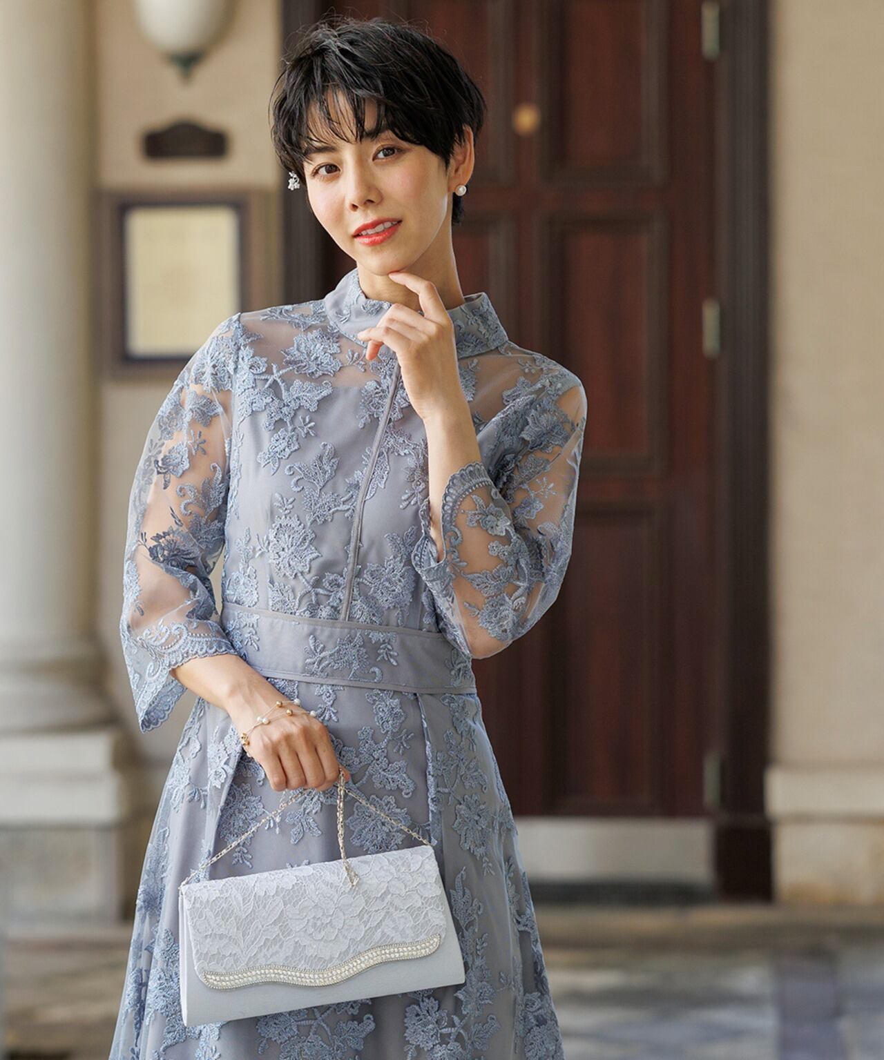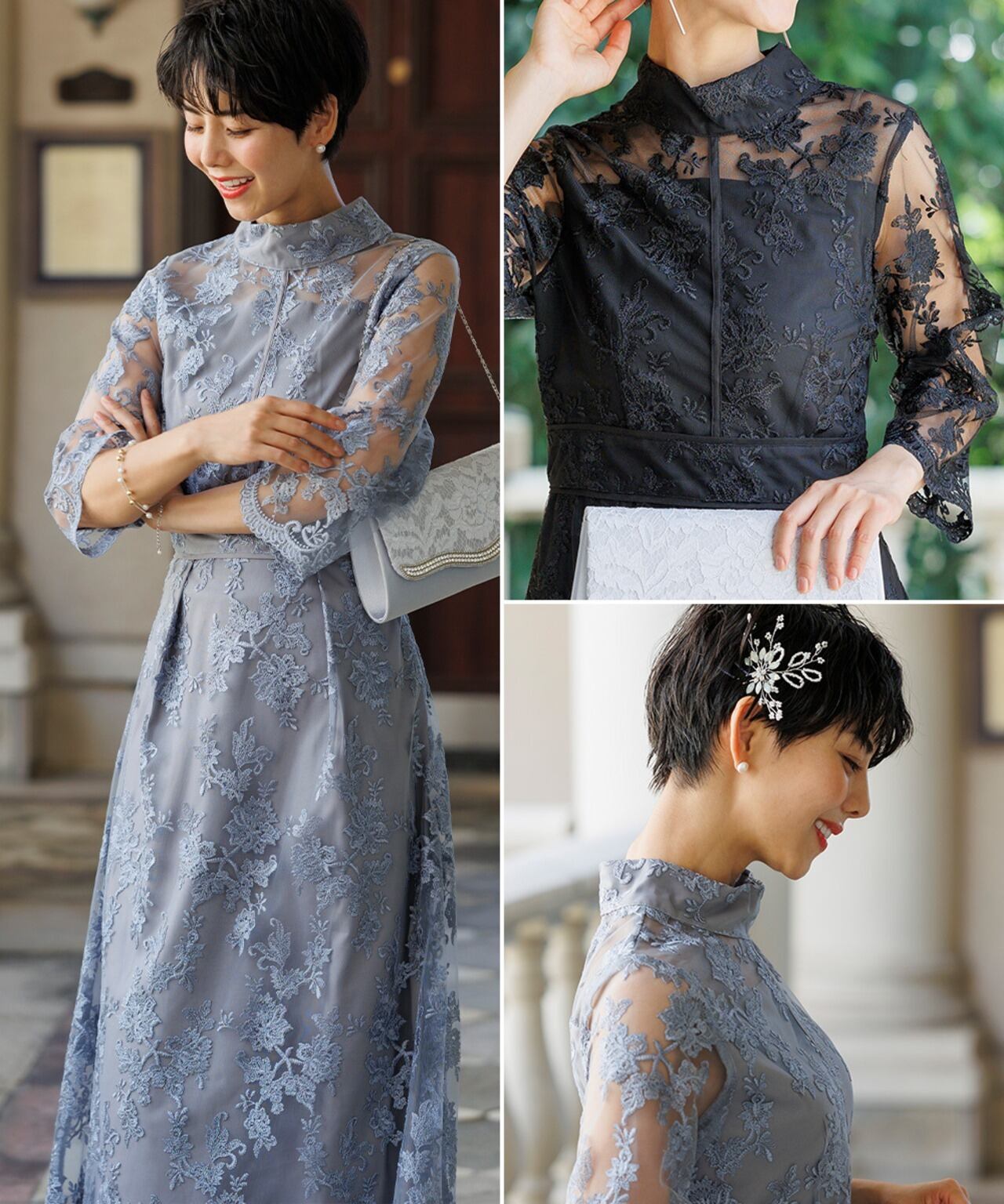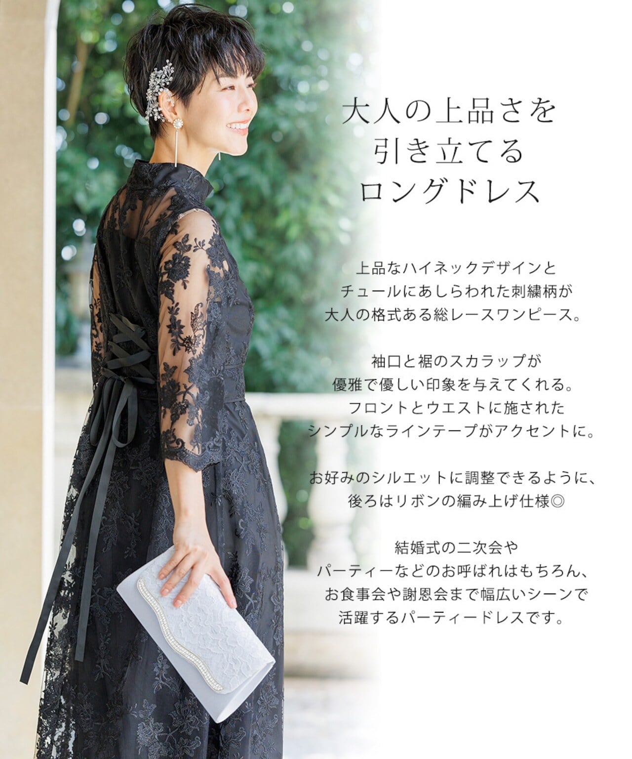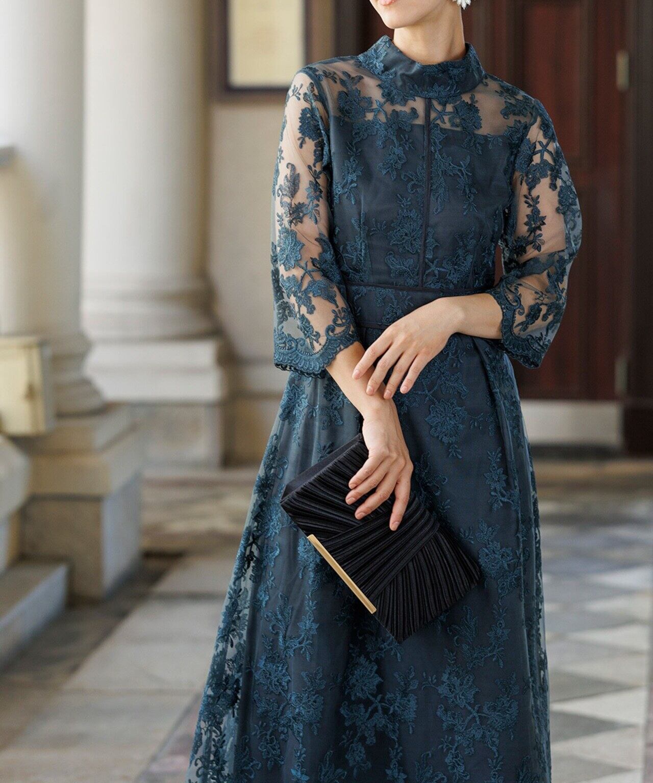 上品なハイネックデザインとチュールにあしらわれた刺繍柄が