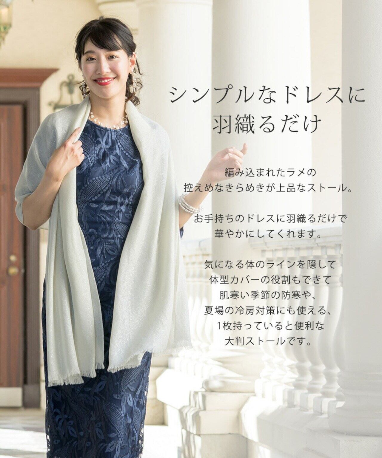 自由なスタイルをオシャレにアレンジ出来る大判サイズは、気になる二の腕ラインもカバー。