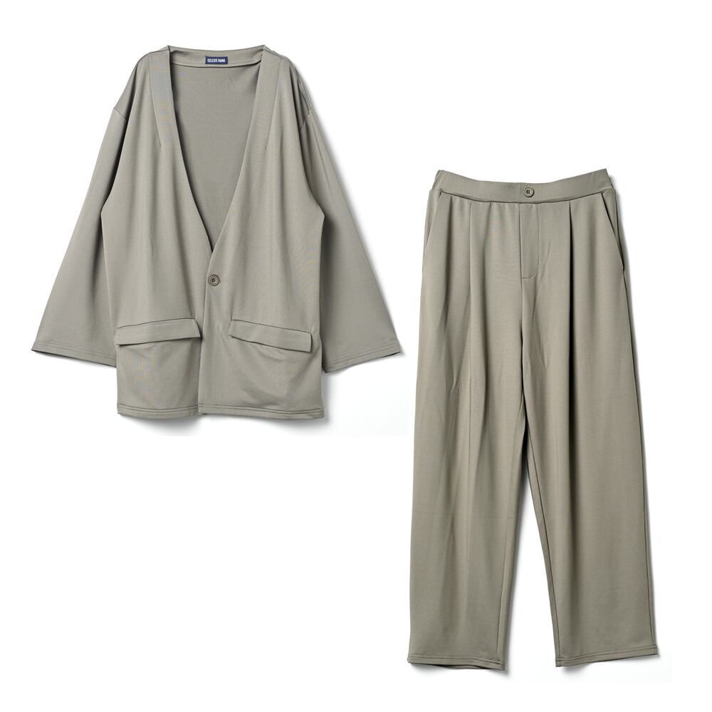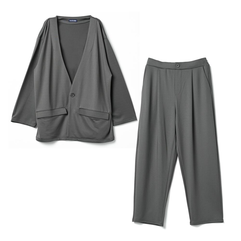 しっかりとした素材感でありながら軽やかな着心地のファッションスーツ。高撥水機能を備えているため、急な雨にも安心して対応できます。シンプルなノーカラージャケットとスラックスの上下セットは、在宅ワークやカジュアルな外出にピッタリ!オールシーズン着用できるデザインで、春夏秋冬問わず活躍間違いなしです◎