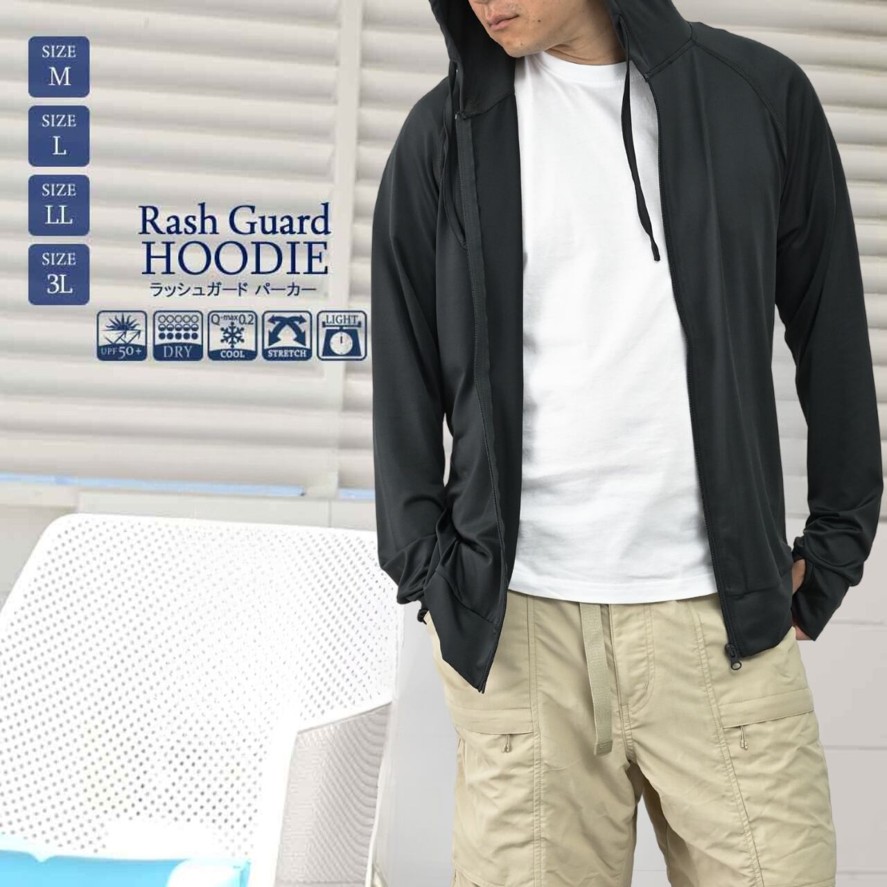 お客様の声をもとに作られた、フード付きラッシュガード。ゆったりと着られるこのラッシュガードはラッシュパーカーとよばれ、 日焼け対策としてマリンスポーツ以外のアクティビティにも利用できますし、気になる体型のカバーとしても有効です。フードを被ると耳や首の後ろの日焼け防止になります。