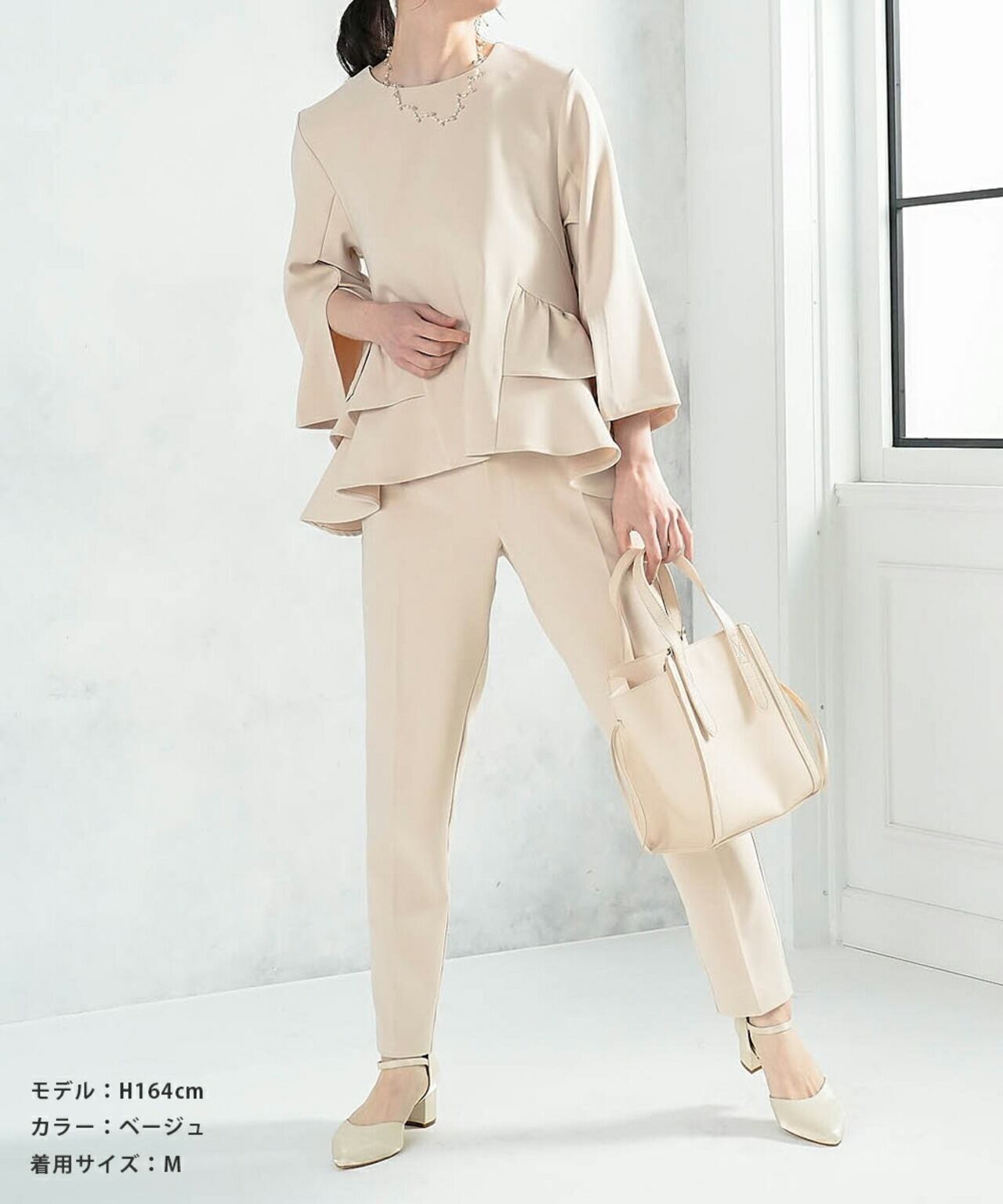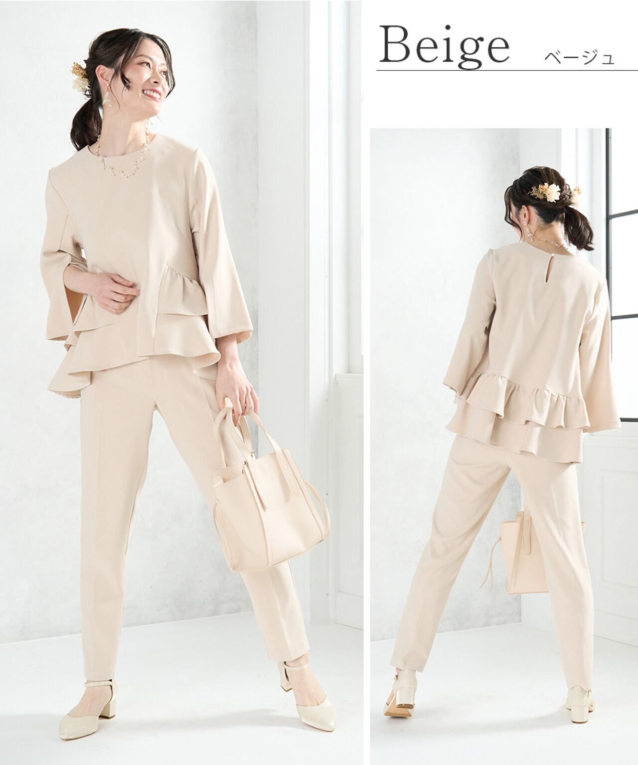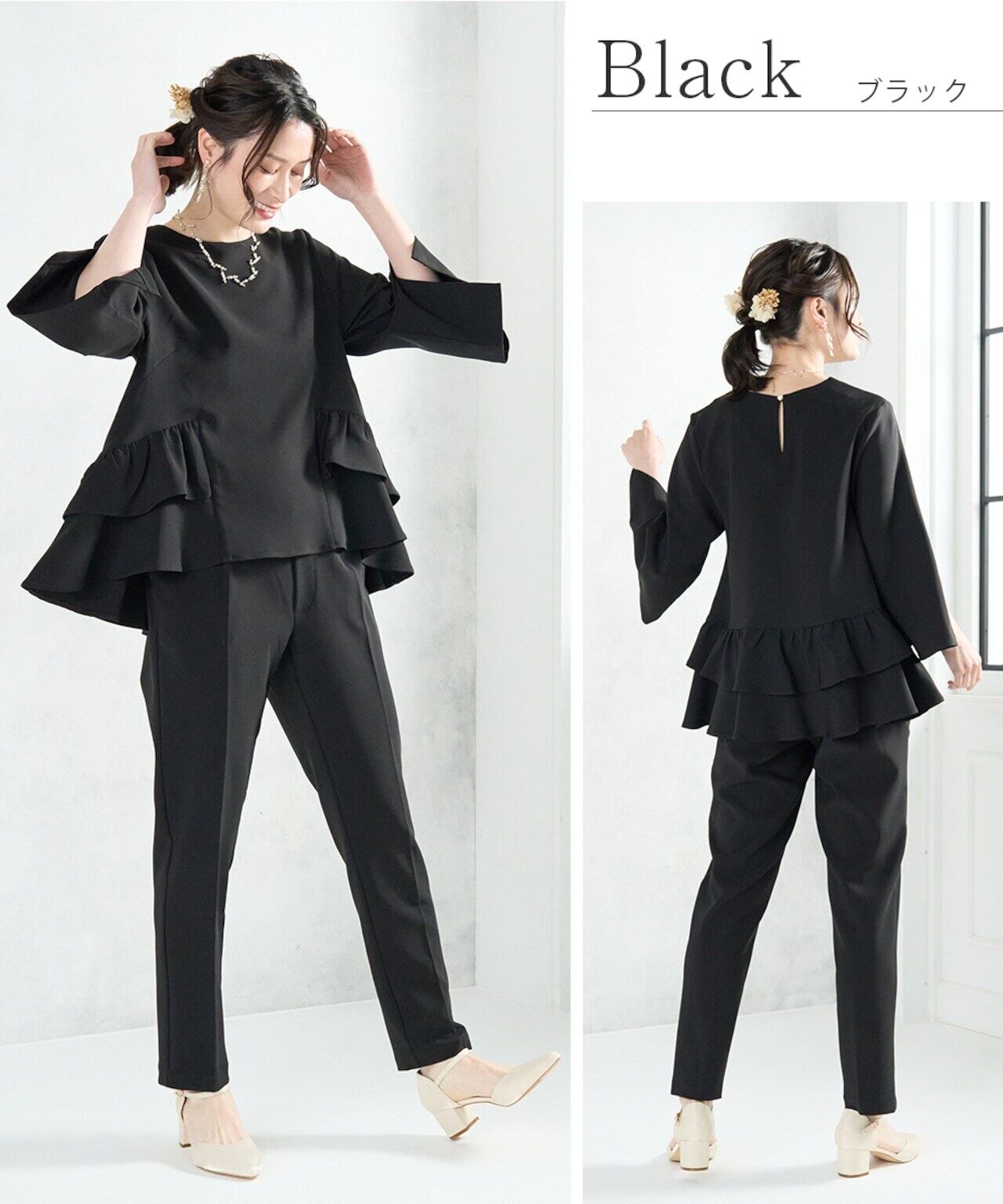 腰回りにフリルが付いたトップスとテーパードパンツのセレモニースーツ。