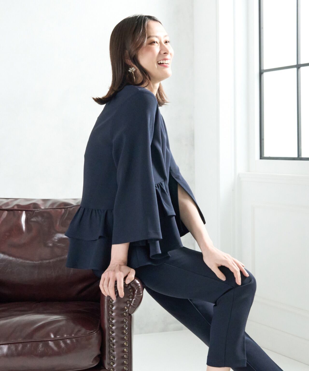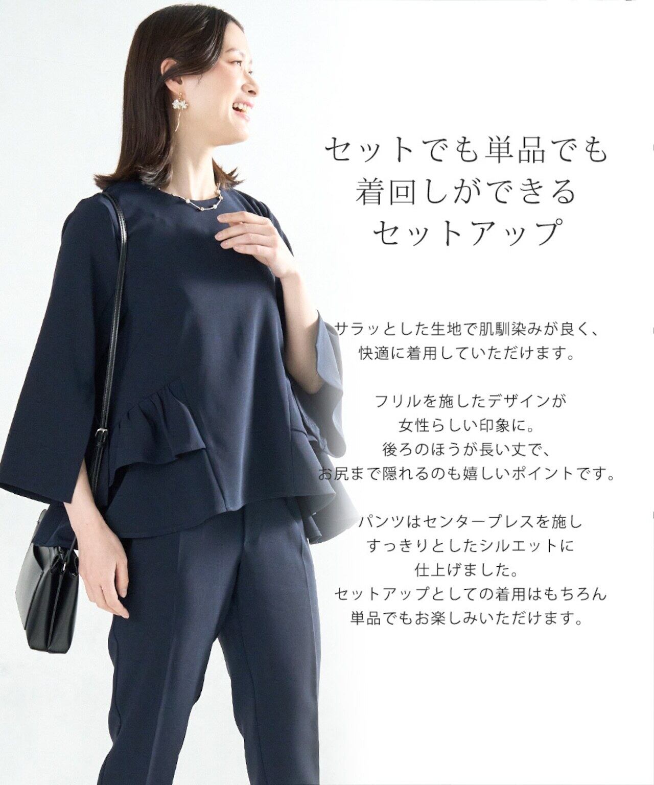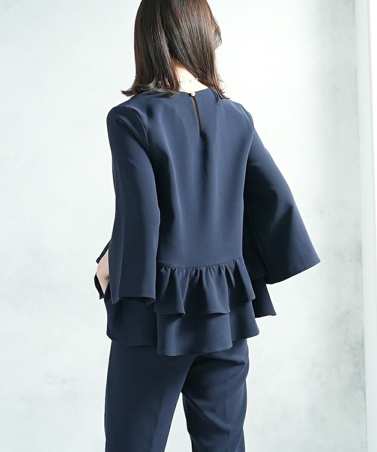腰回りにフリルが付いたトップスとテーパードパンツのセレモニースーツ。