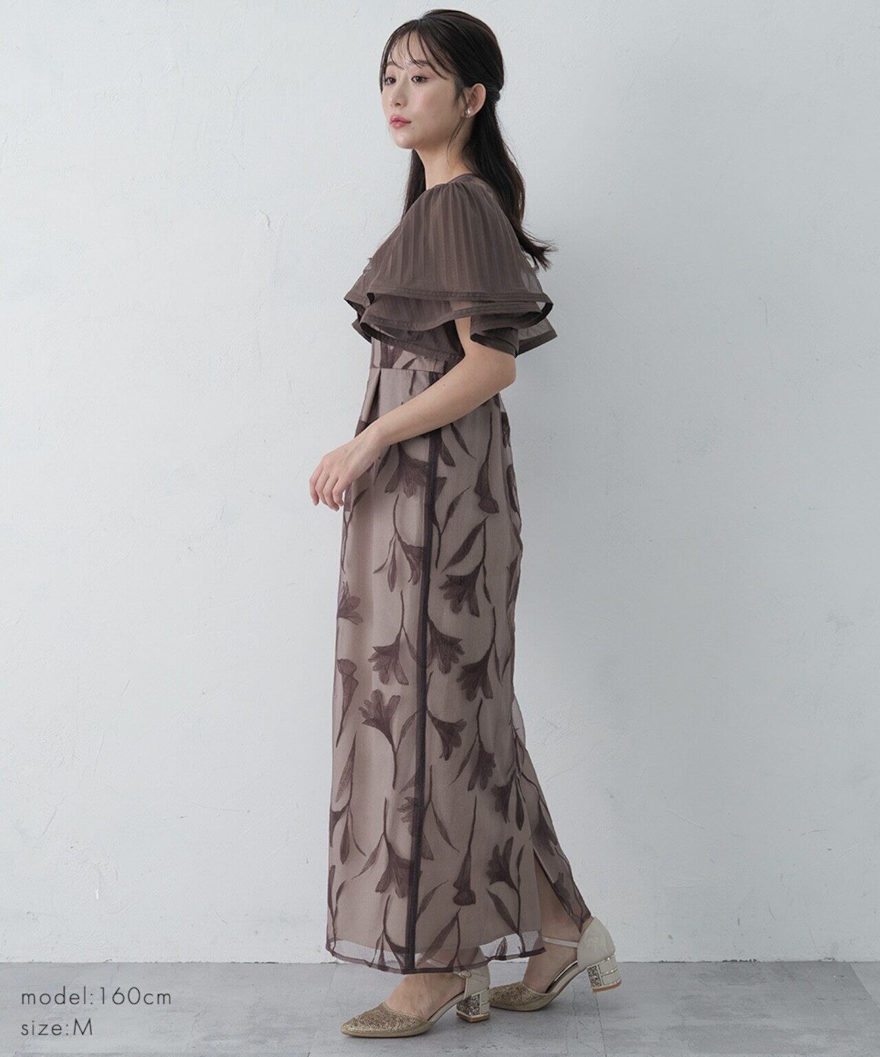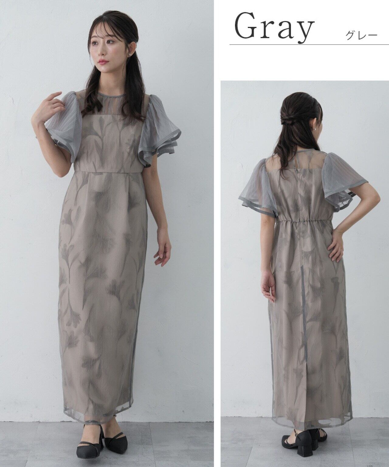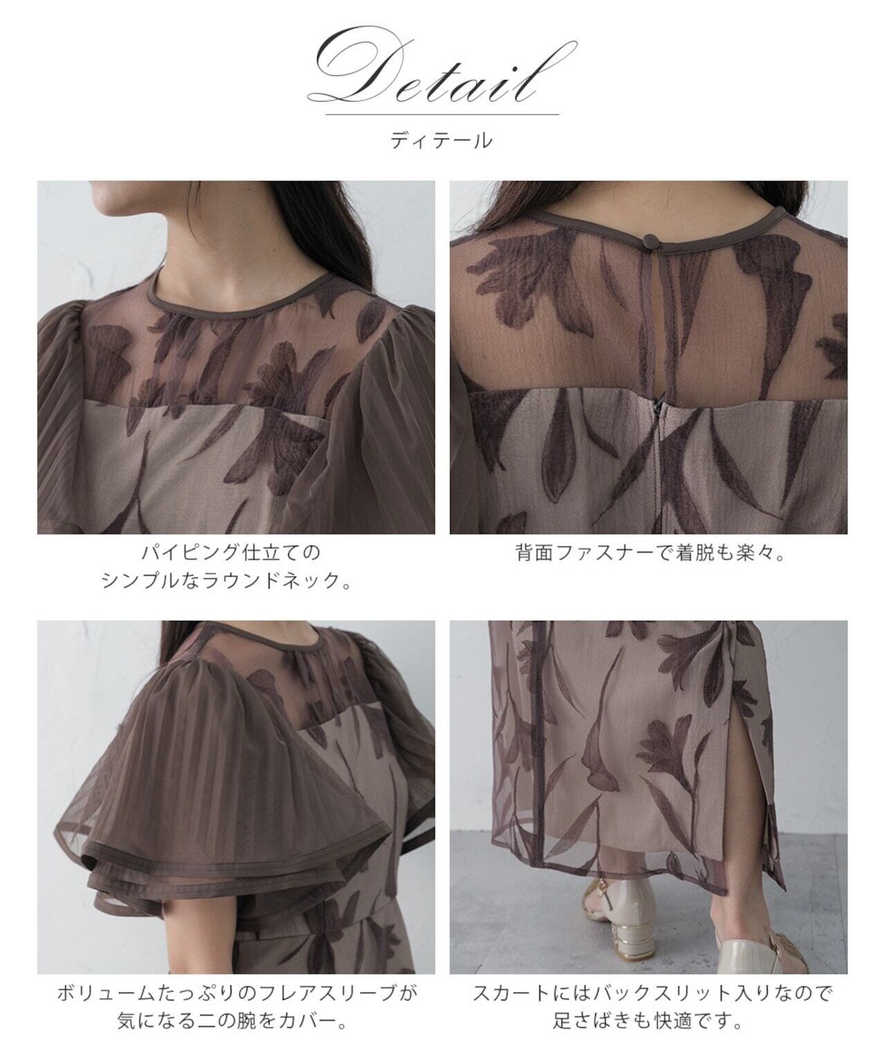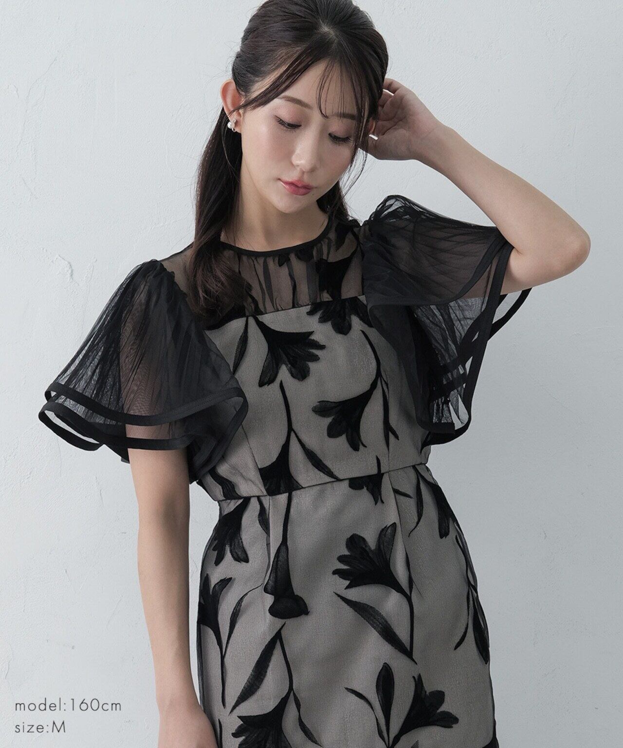 フリルスリーブとフロッキー素材の花柄がより際立つバランスに。
