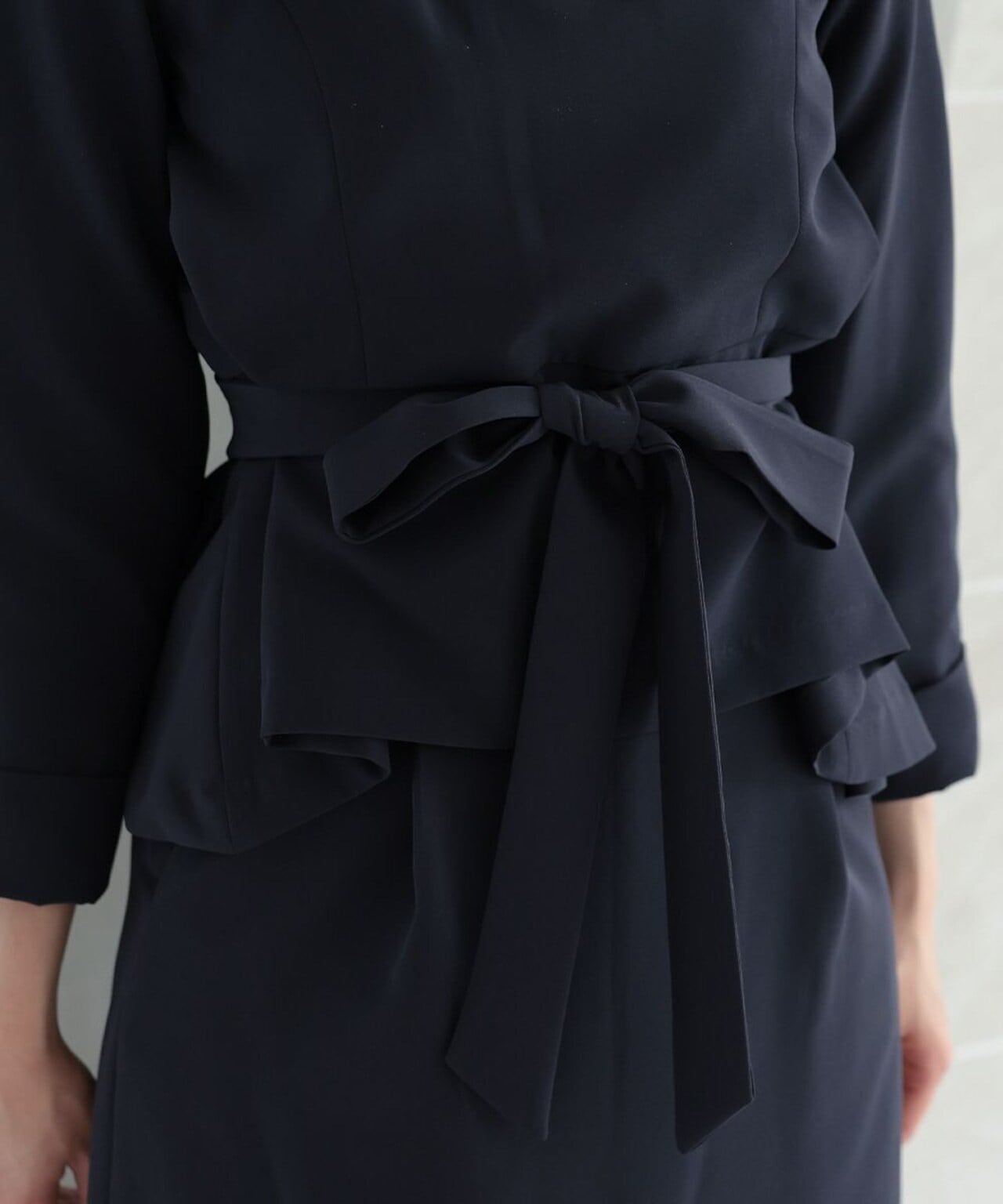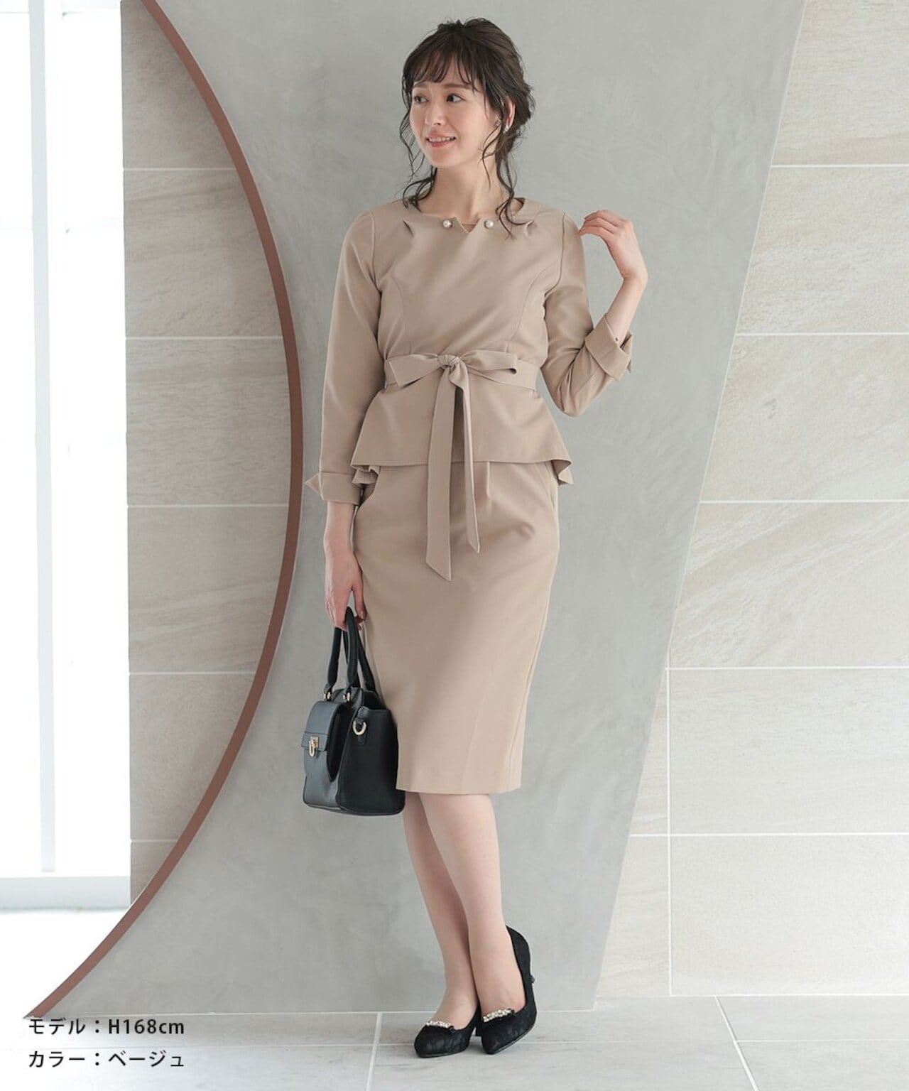 イミテーションパールのアクセサリーとウエストのリボンが、