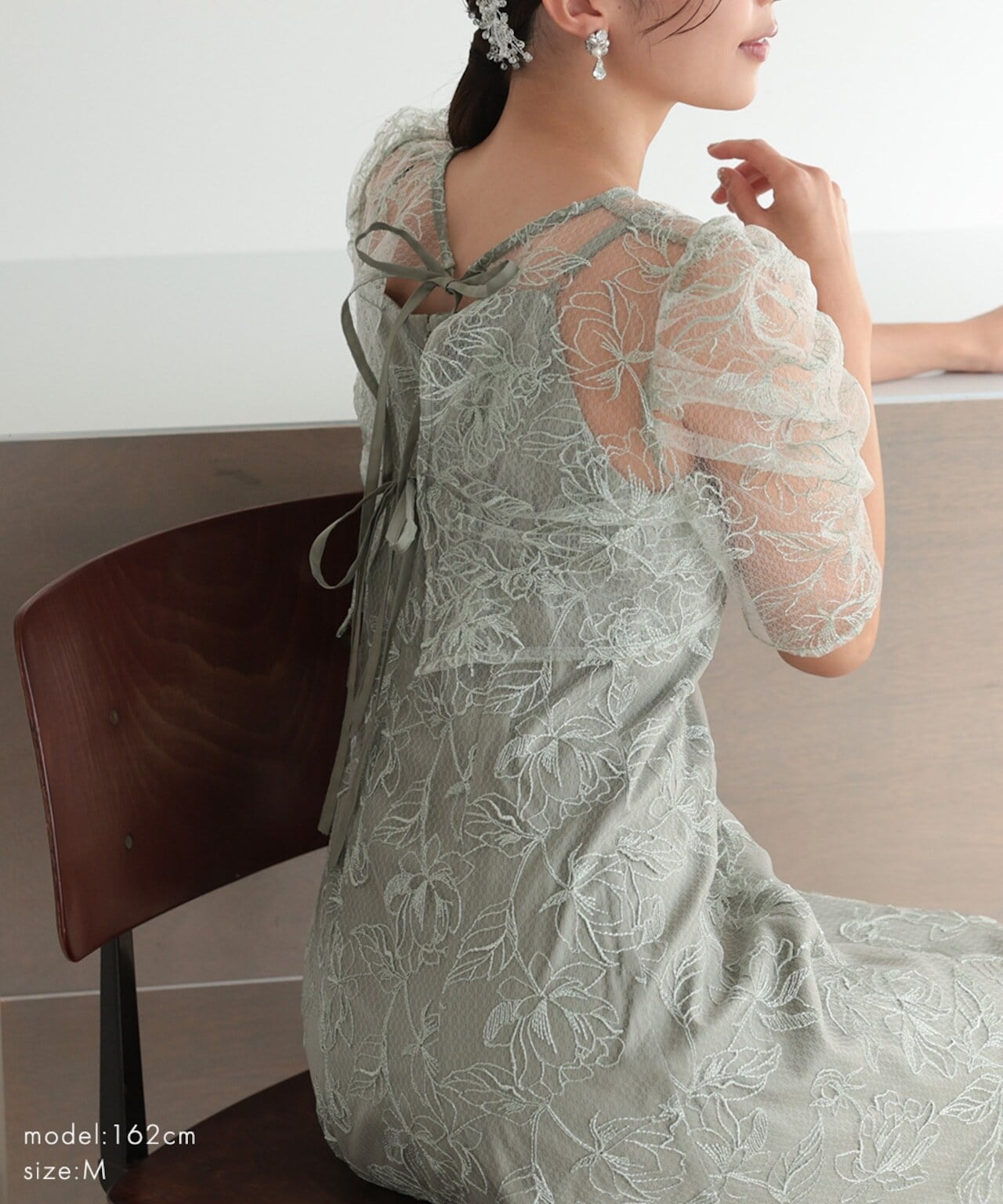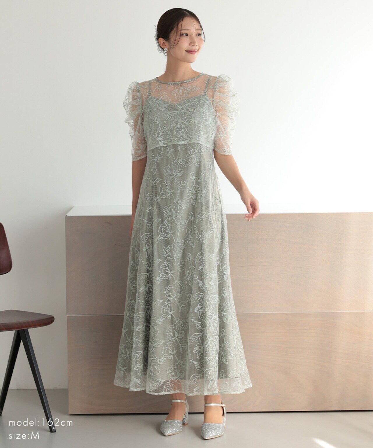 ワンピースは全身に繊細な総柄レースを使用した、華やかでドレッシーなIフレアシルエット。