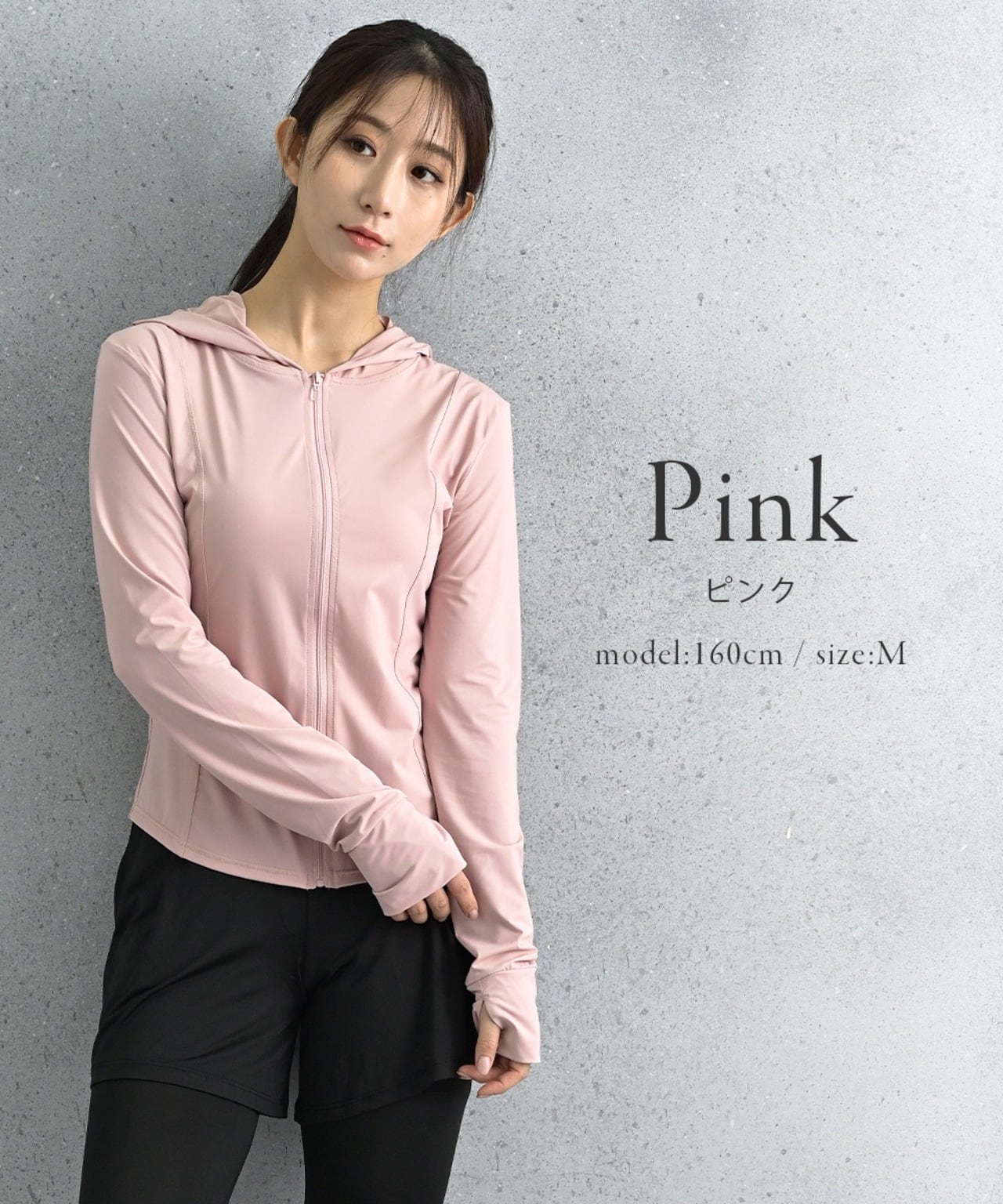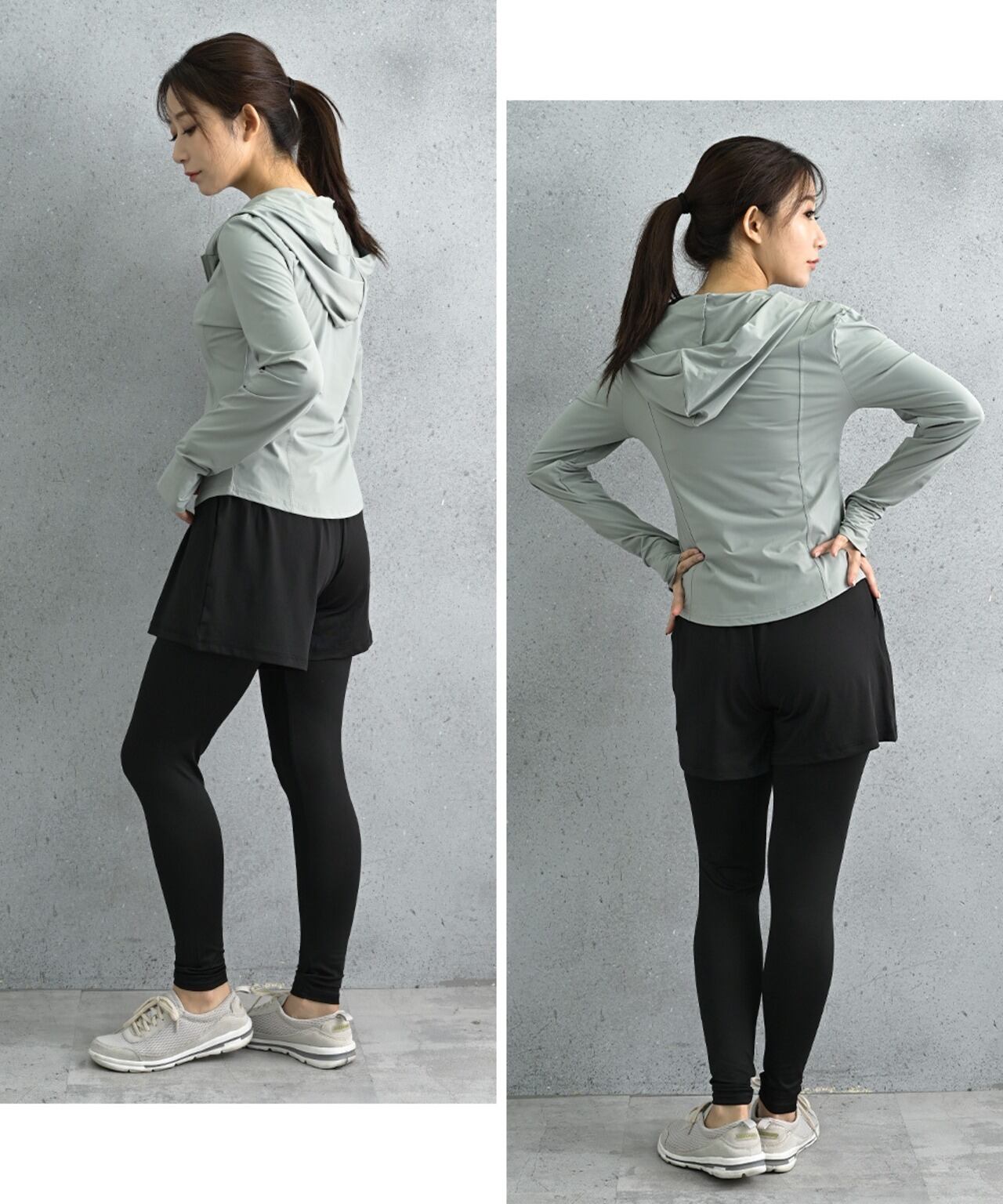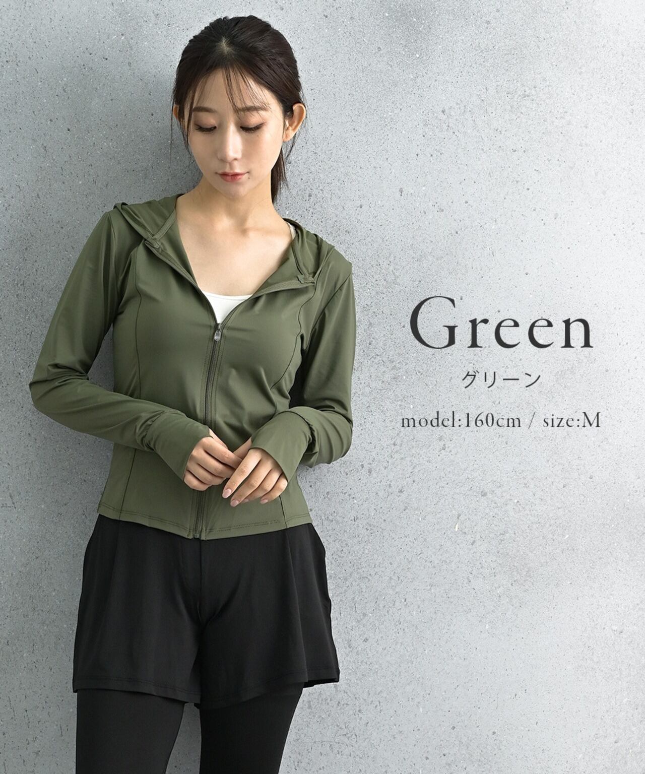 フードと指穴付きで首元・手の甲までしっかりUVカット(UPF50+・95%以上)。