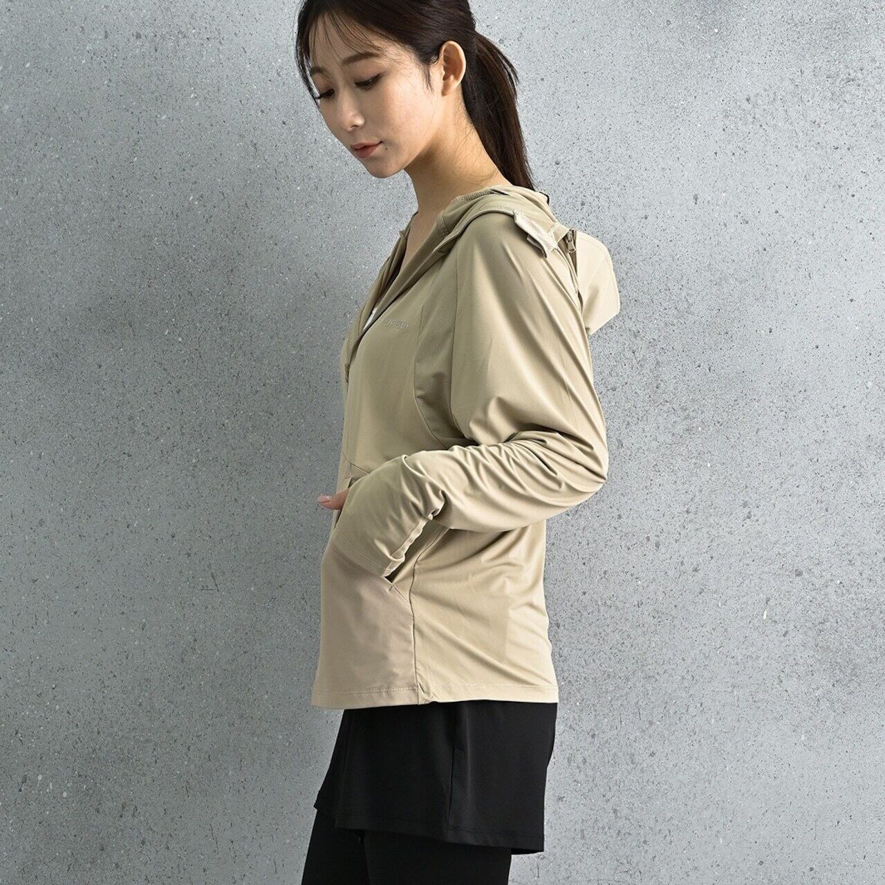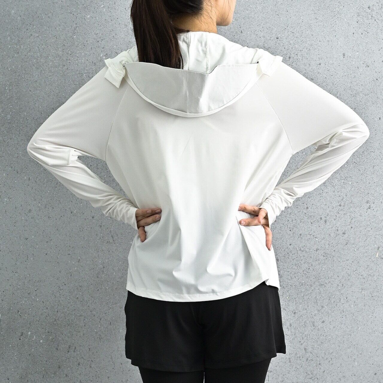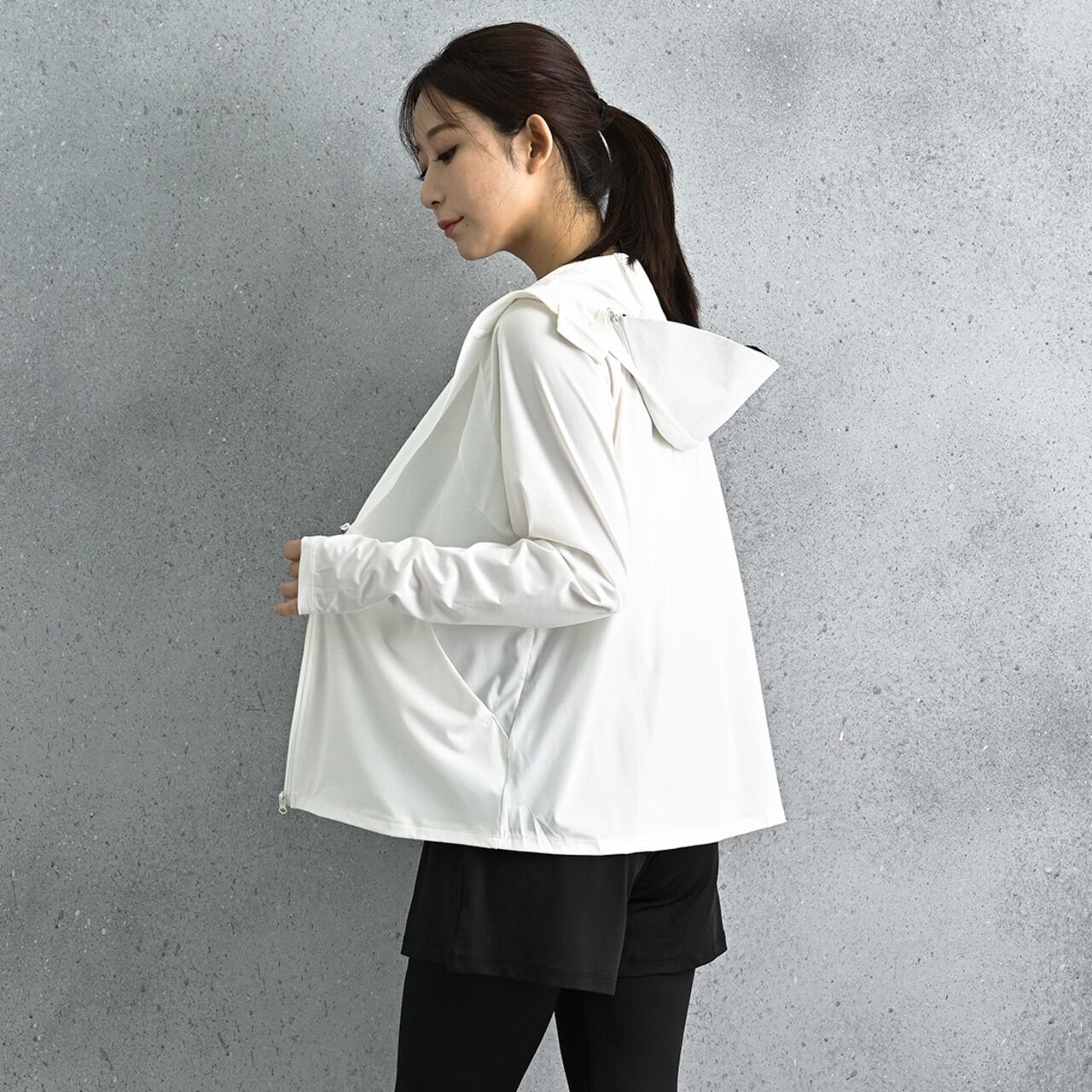 つば付きフード(取り外し可能)、ハイネック、指穴付き袖で顔から手の甲までしっかり紫外線対策◎