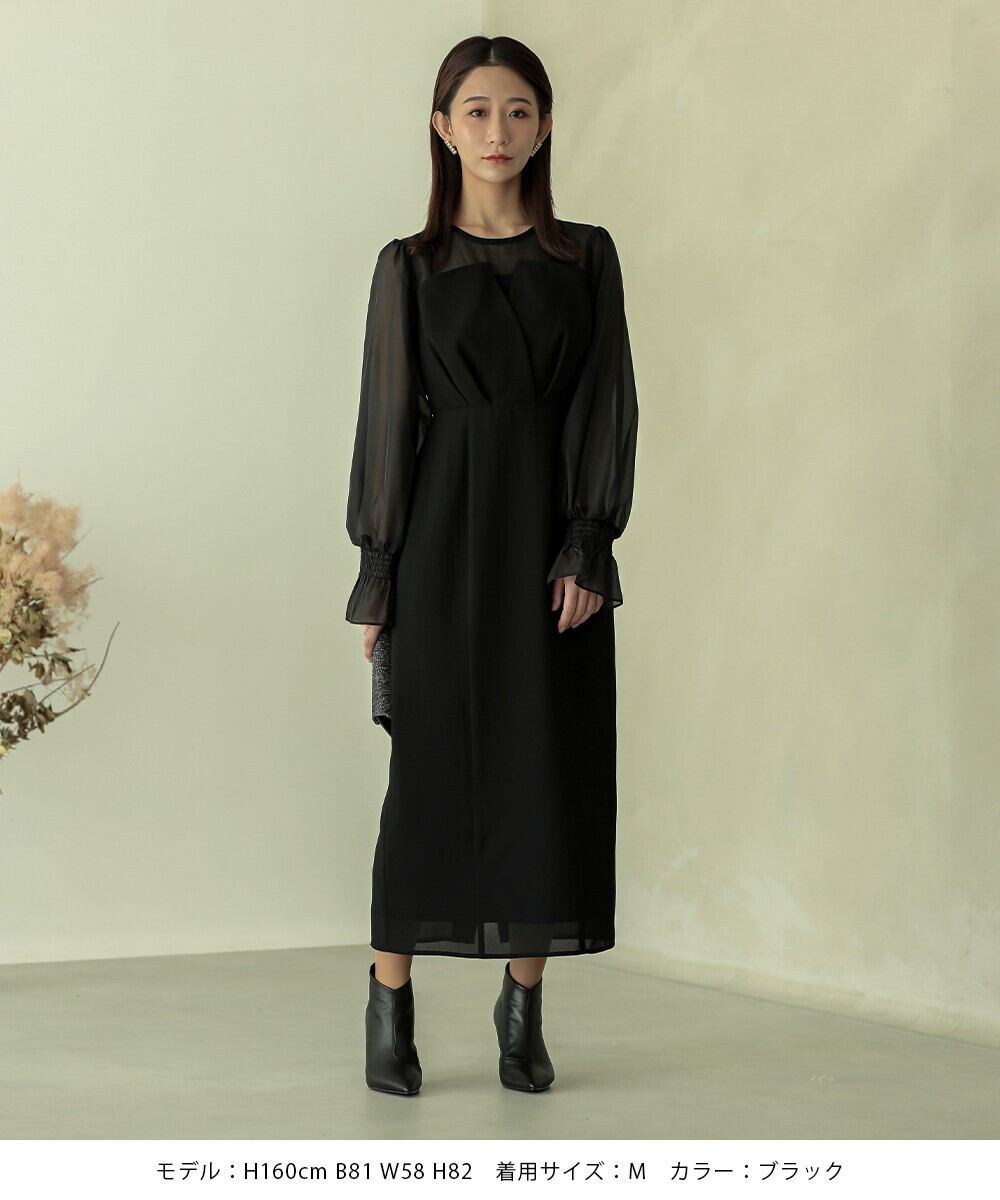 印象的なビスチェ風デザインに、セミタイトのシルエットが上品なワンピースドレス。