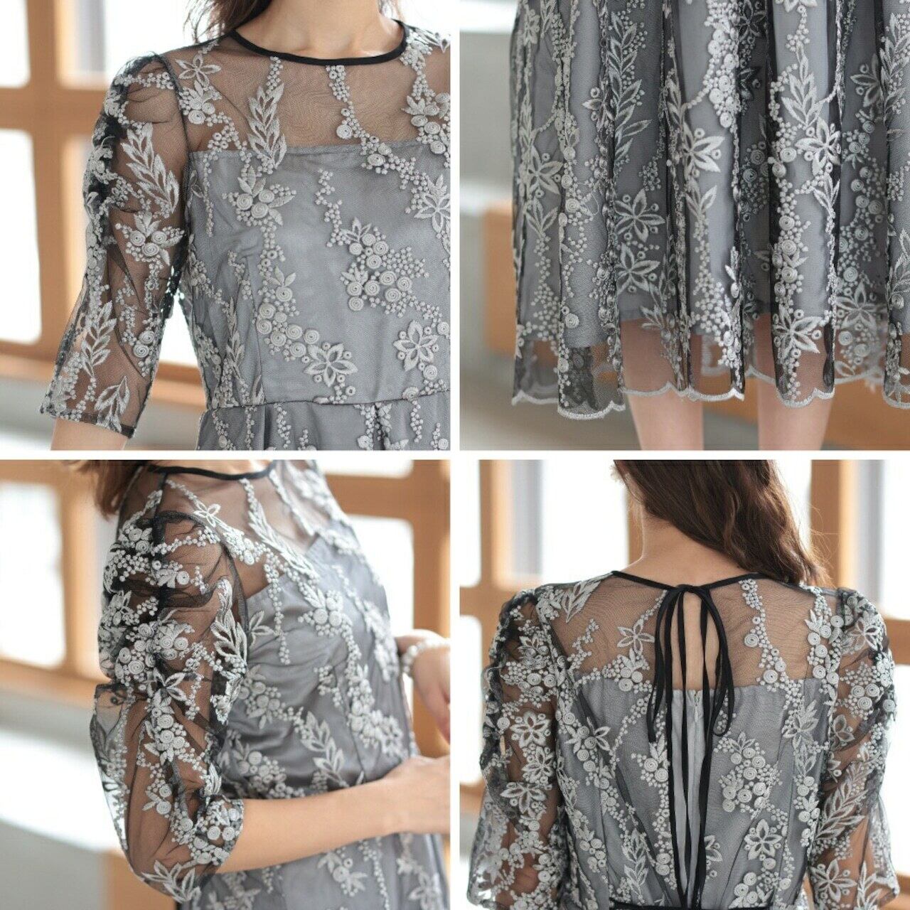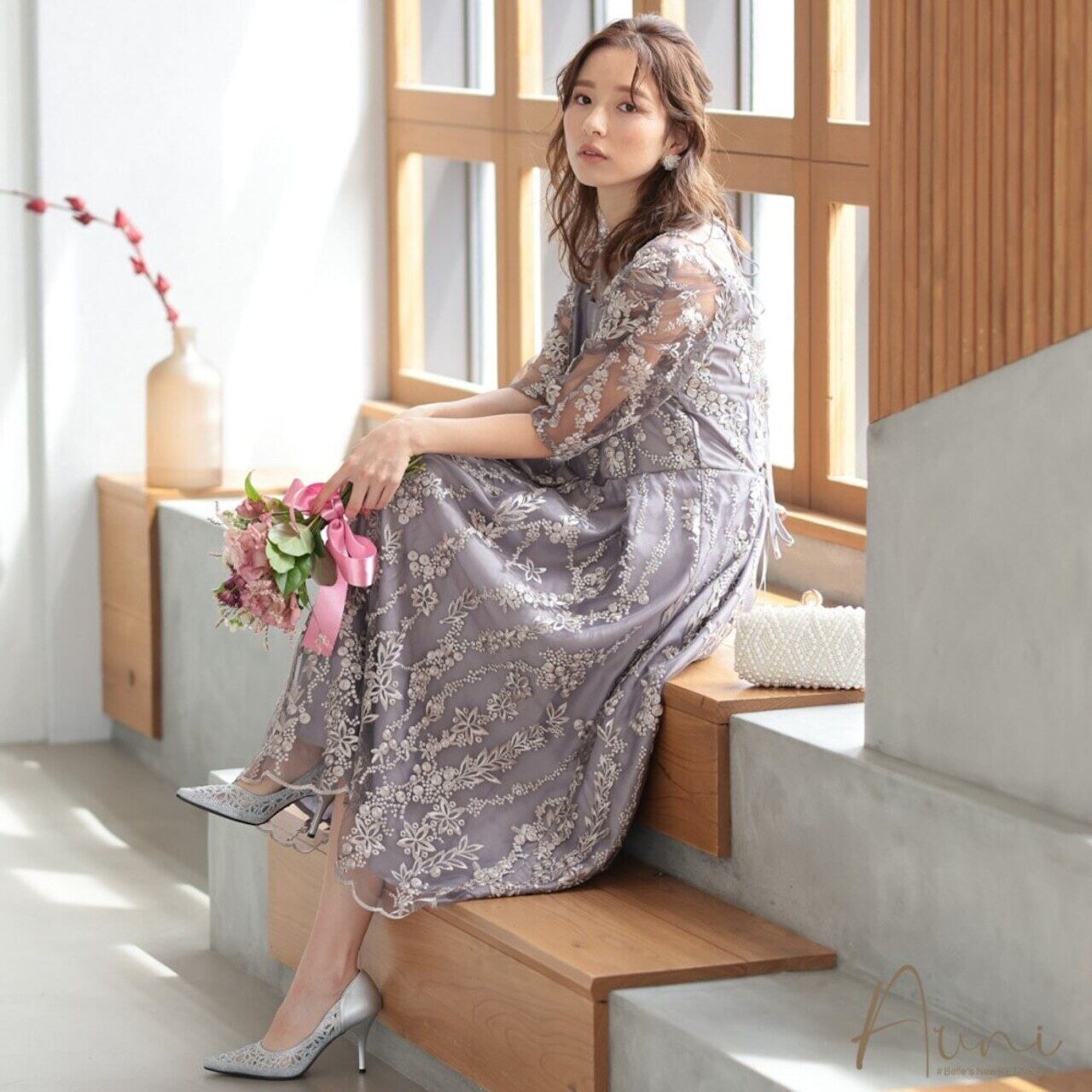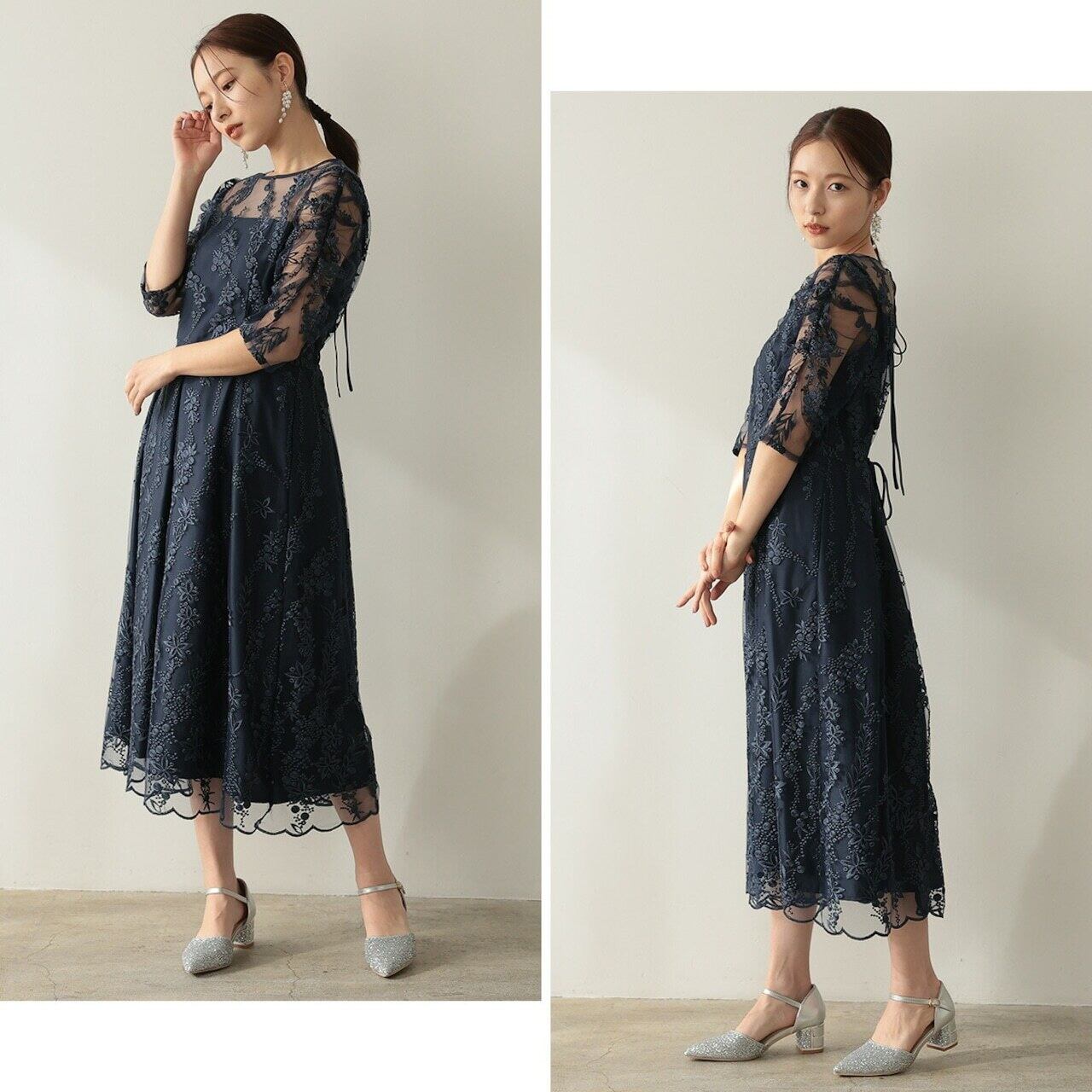 女性らしく可憐な雰囲気の花柄刺繍ドレス。