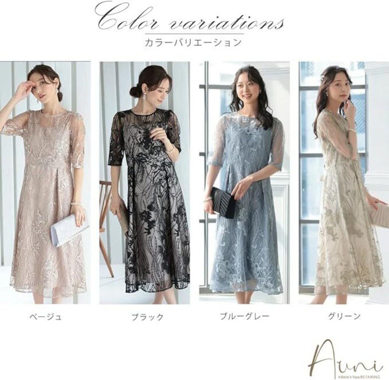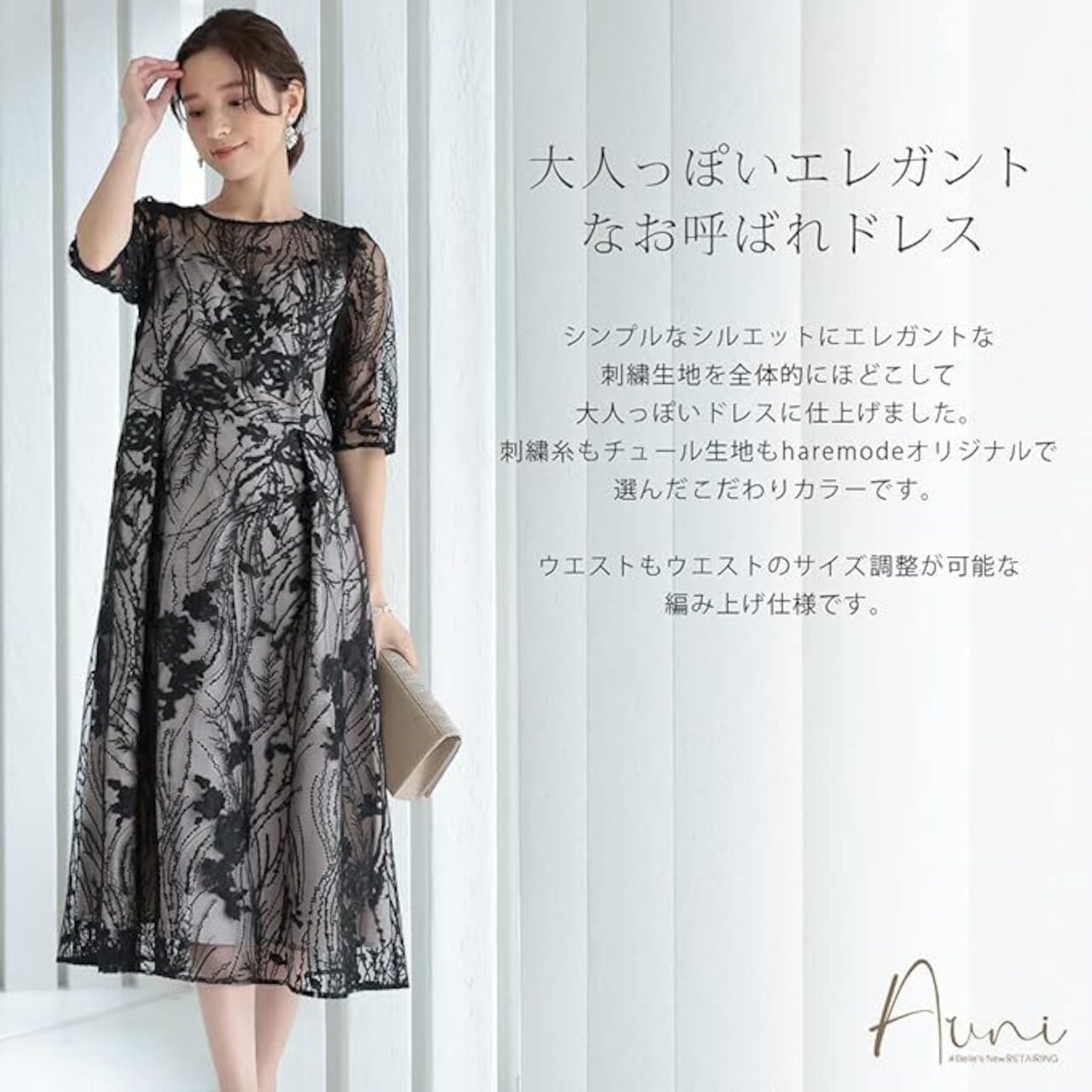 シンプルなシルエットにエレガントな刺繍生地を全体的にほどこして大人っぽいドレスに仕上げました。 刺繍糸もチュール生地もharemodeオリジナルで選んだこだわりカラーです。
