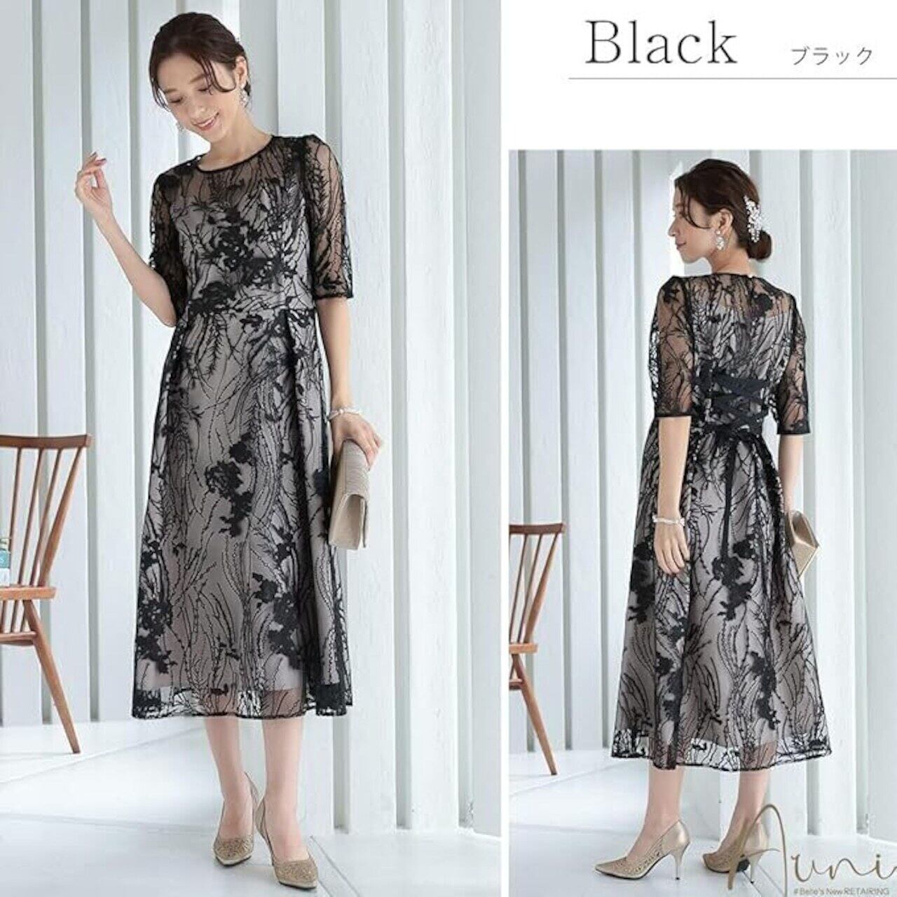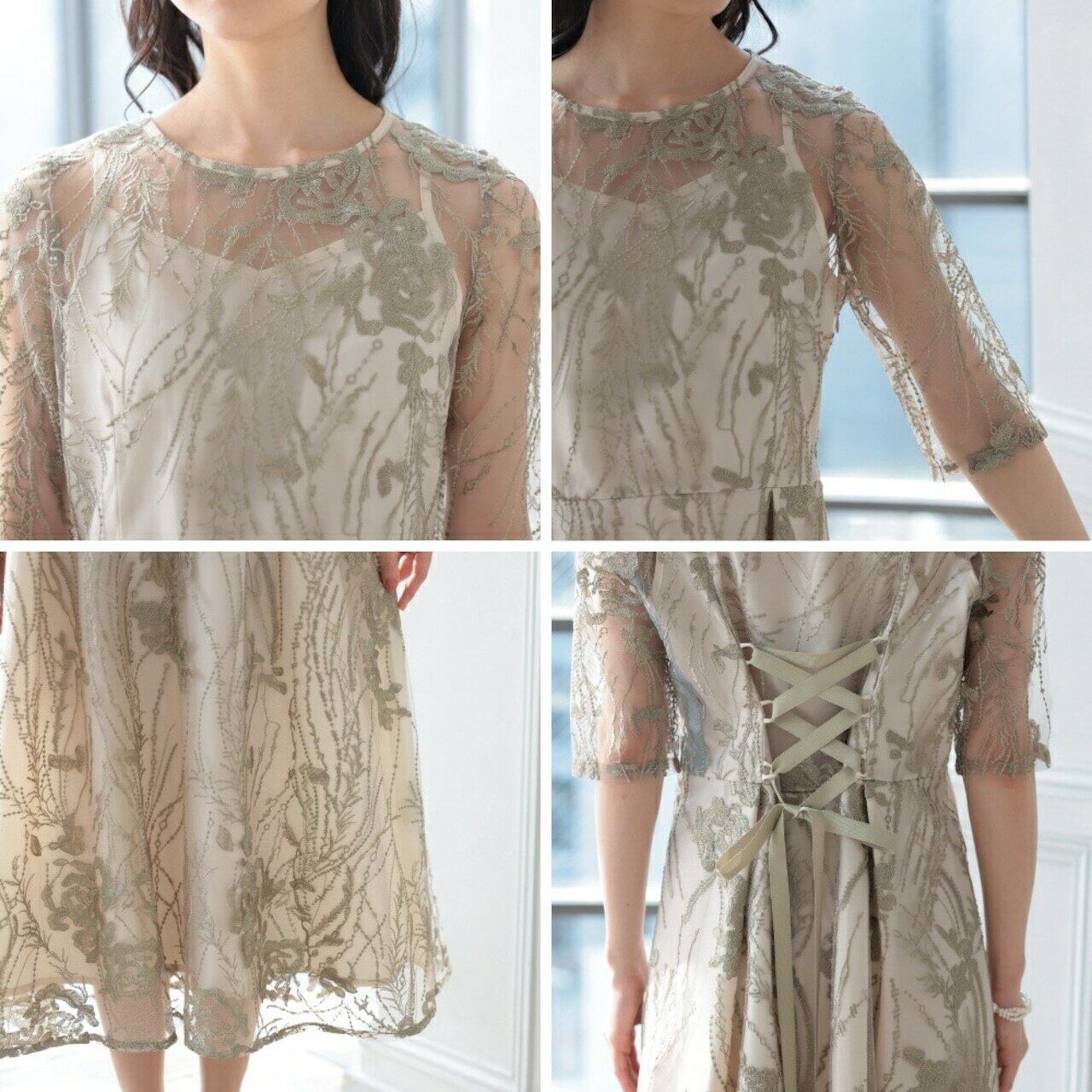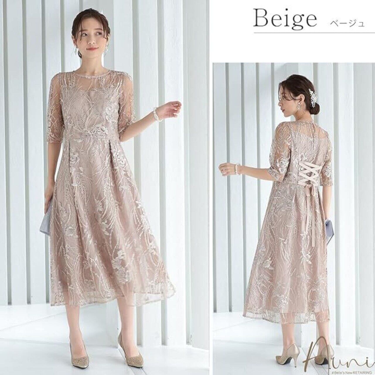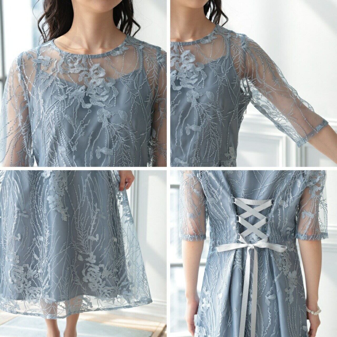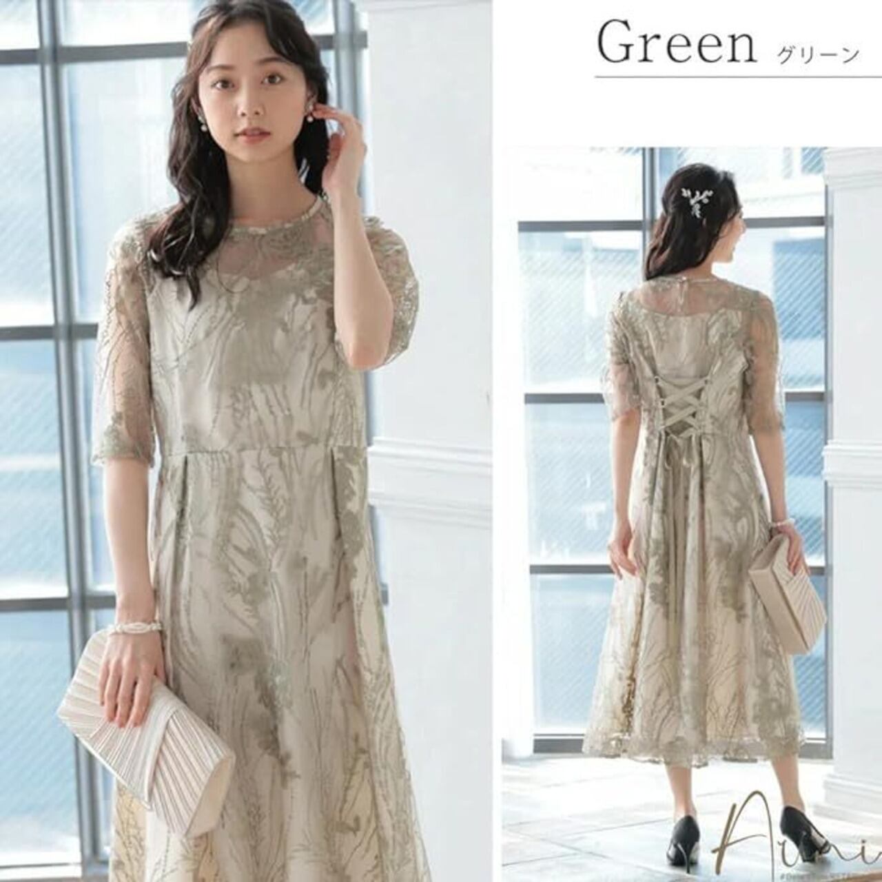 ウエストもウエストのサイズ調整が可能な編み上げ仕様です。 大人っぽい着こなしがかなうエレガントなお呼ばれドレスです。