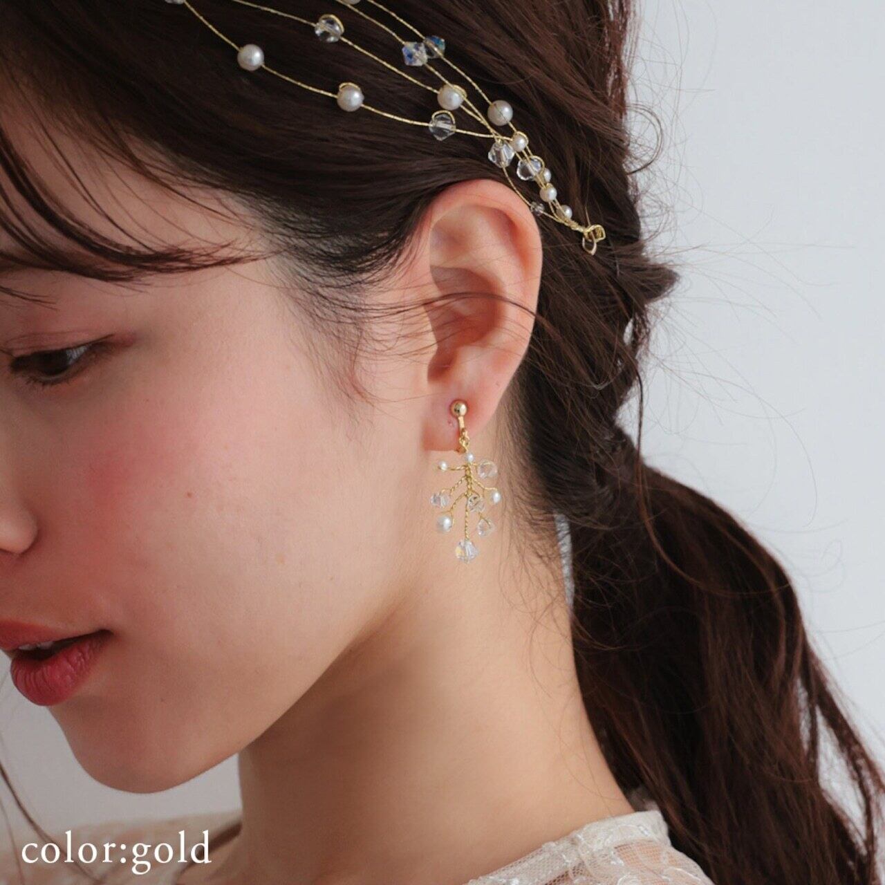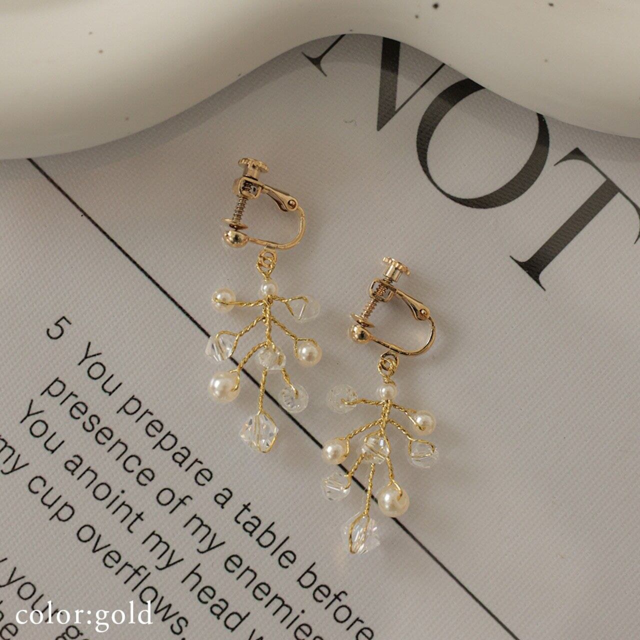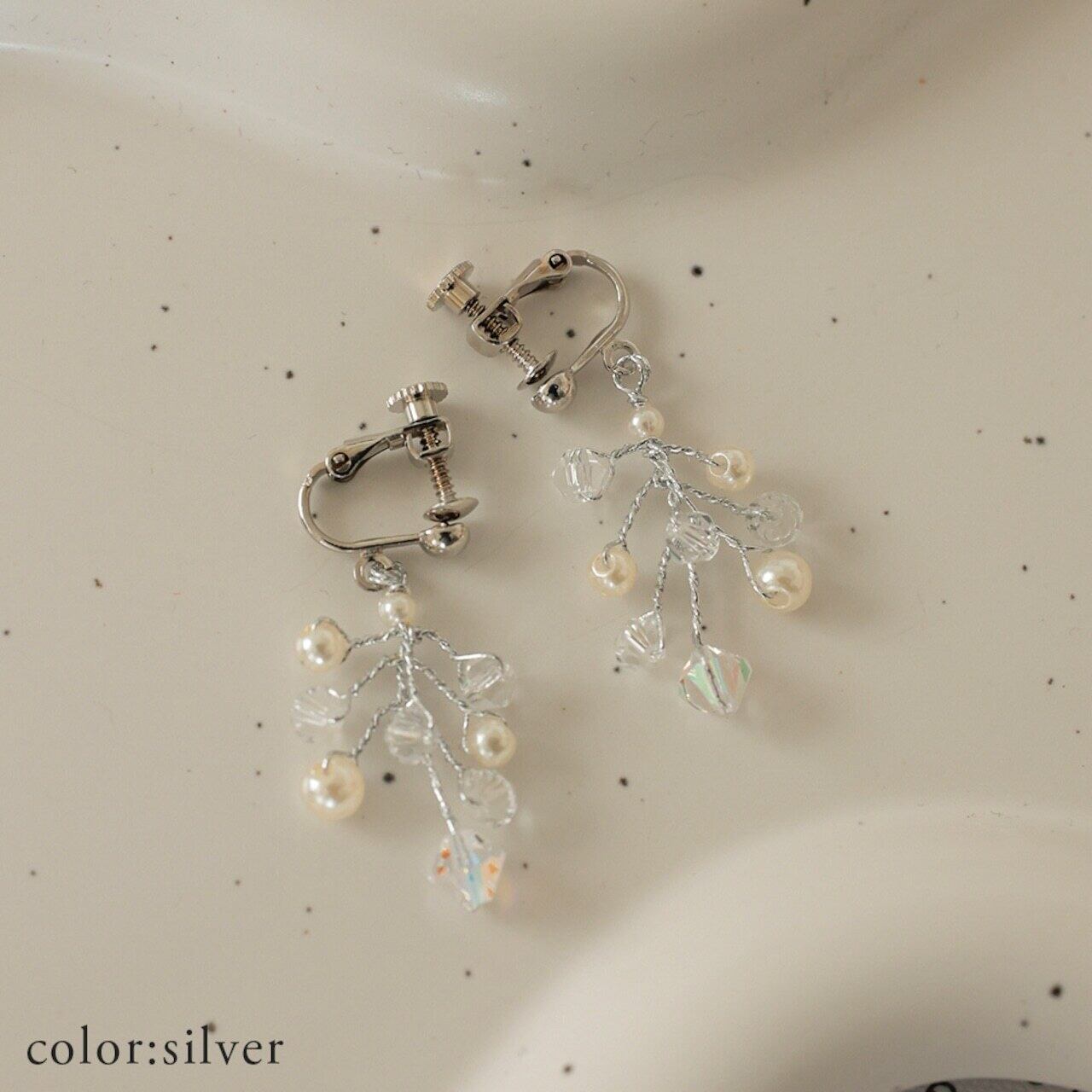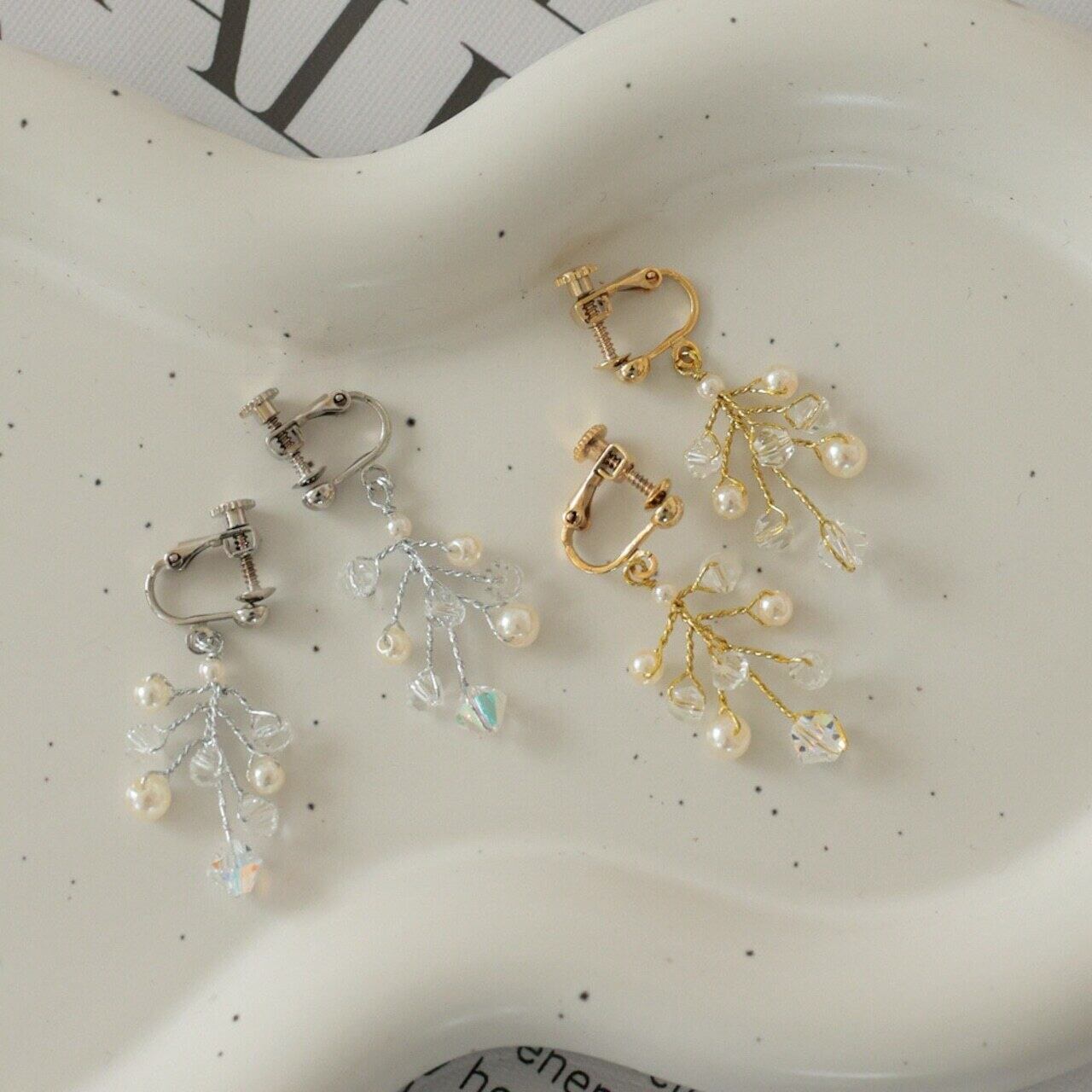 繊細な小枝のように広がるデザインに、パールとビーズのきらめきを添えたイヤリング。